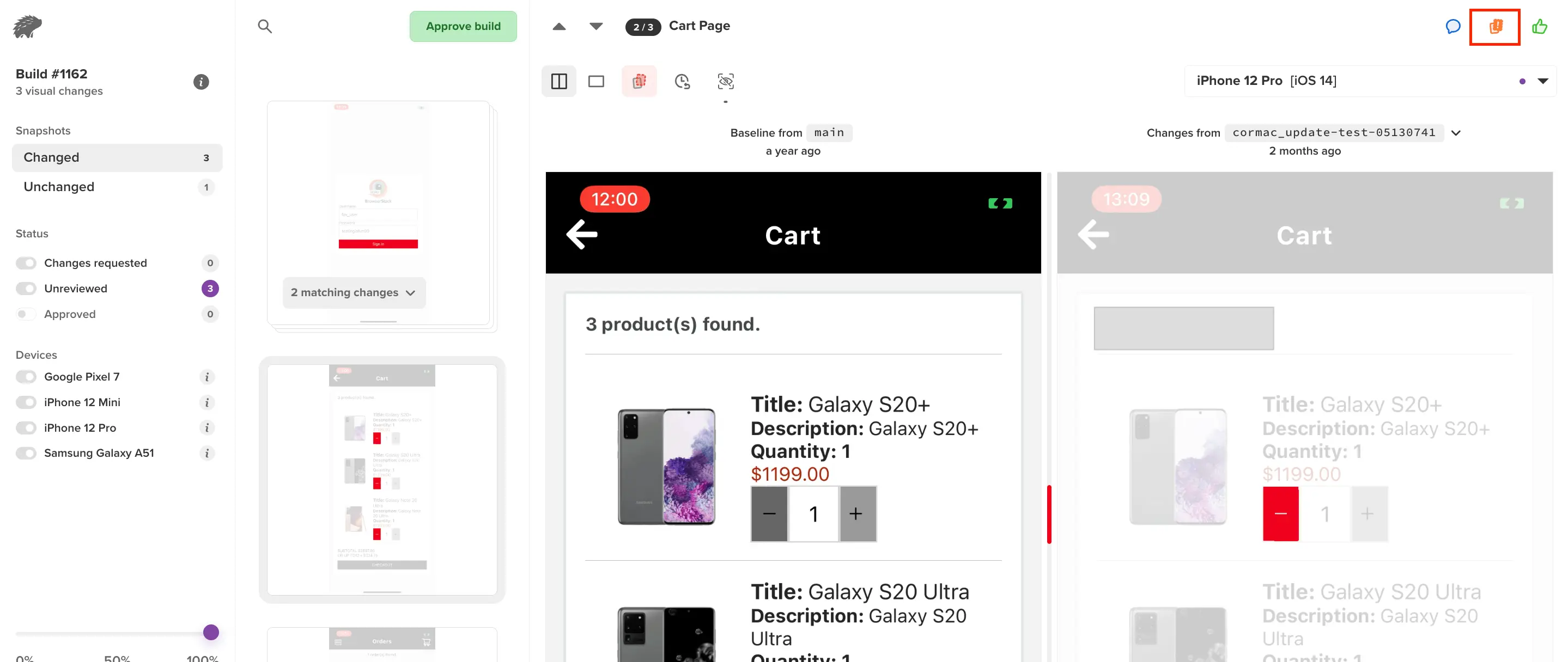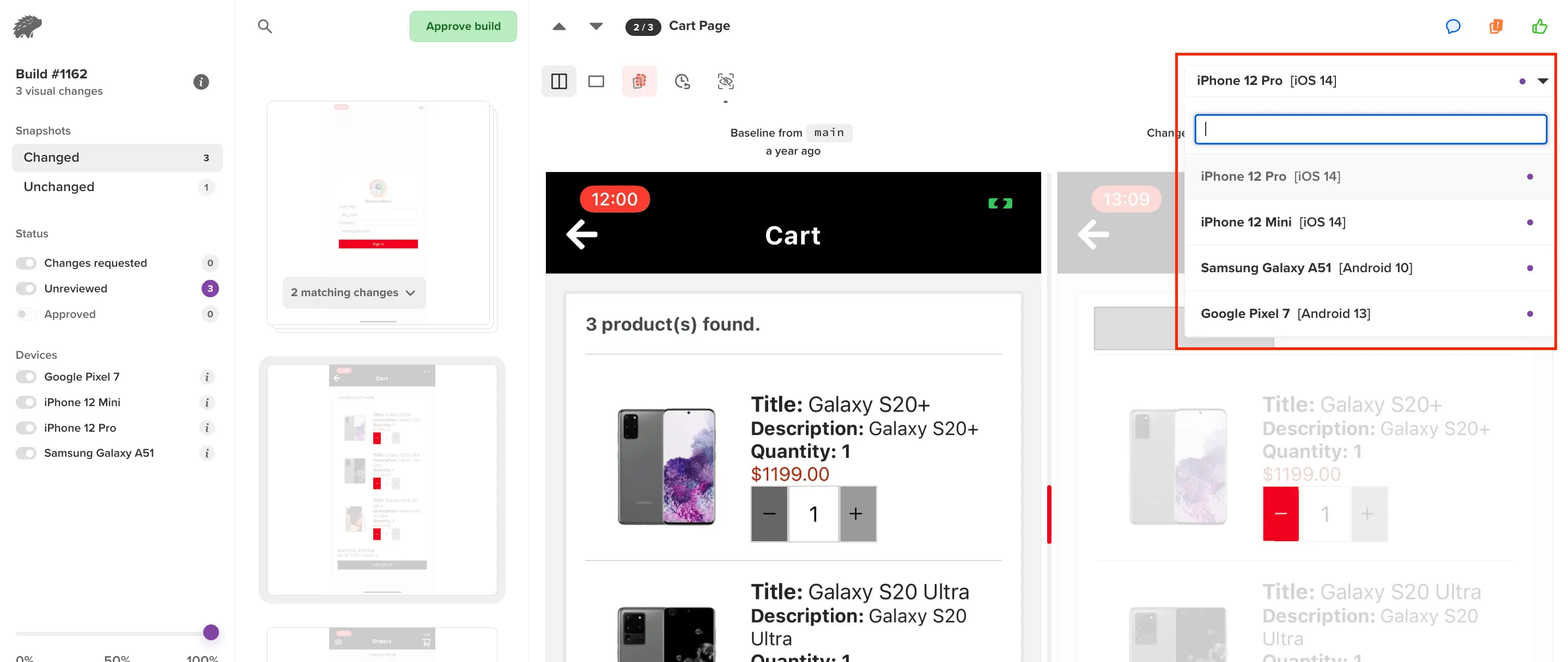 Note: You can only approve snapshots, and not individual screenshots. This means that you can approve snapshots, which has screenshots captured across all devices. However, it is not possible to approve individual screenshots taken on a specific browser for a specific width.