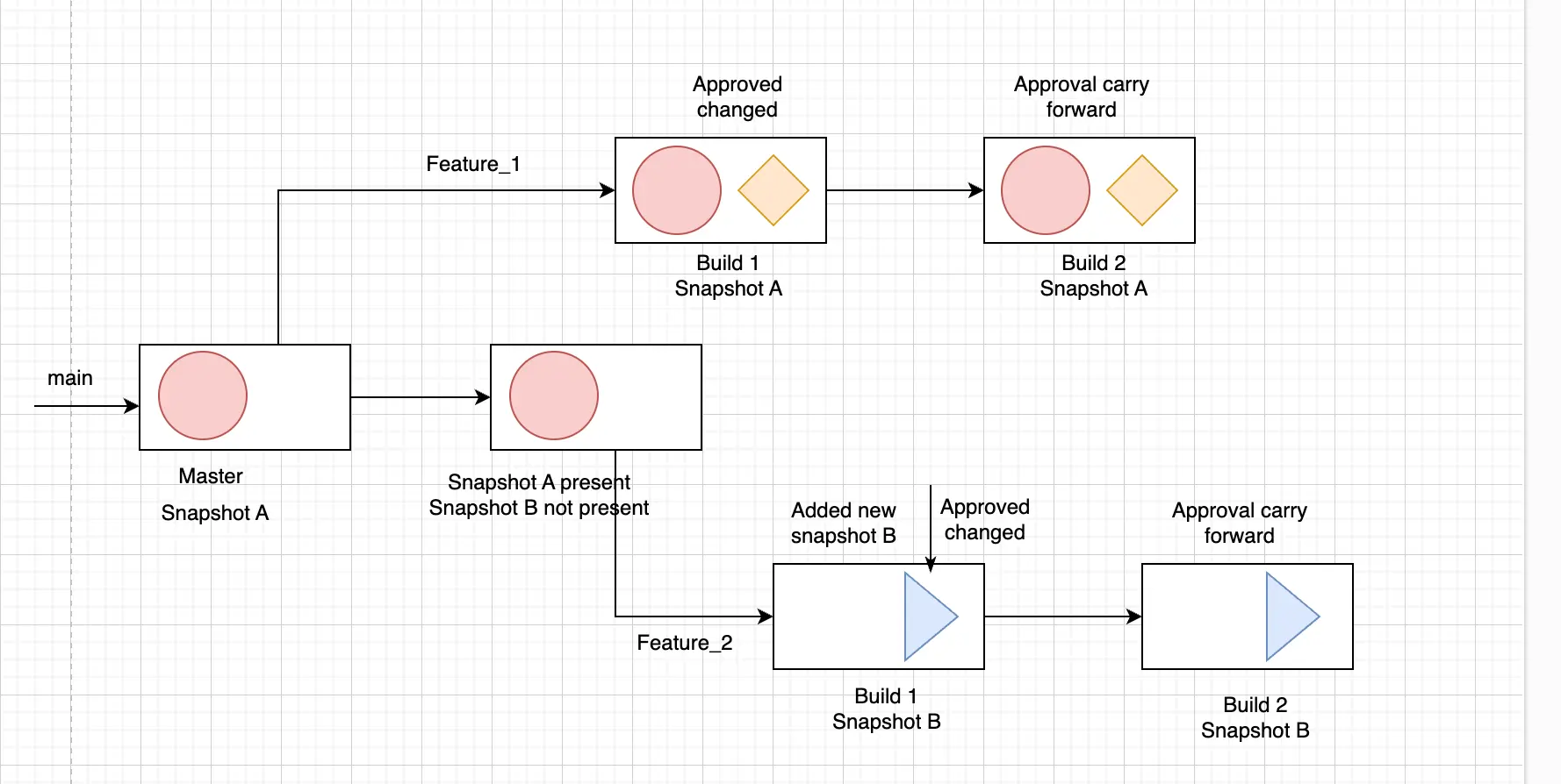 - You create another build in the feature branch Build 2. The snapshot in Build 2 remains exactly the same as the one in Build 1. In this case, the approval from Build 1 is carried forward to Build 2.