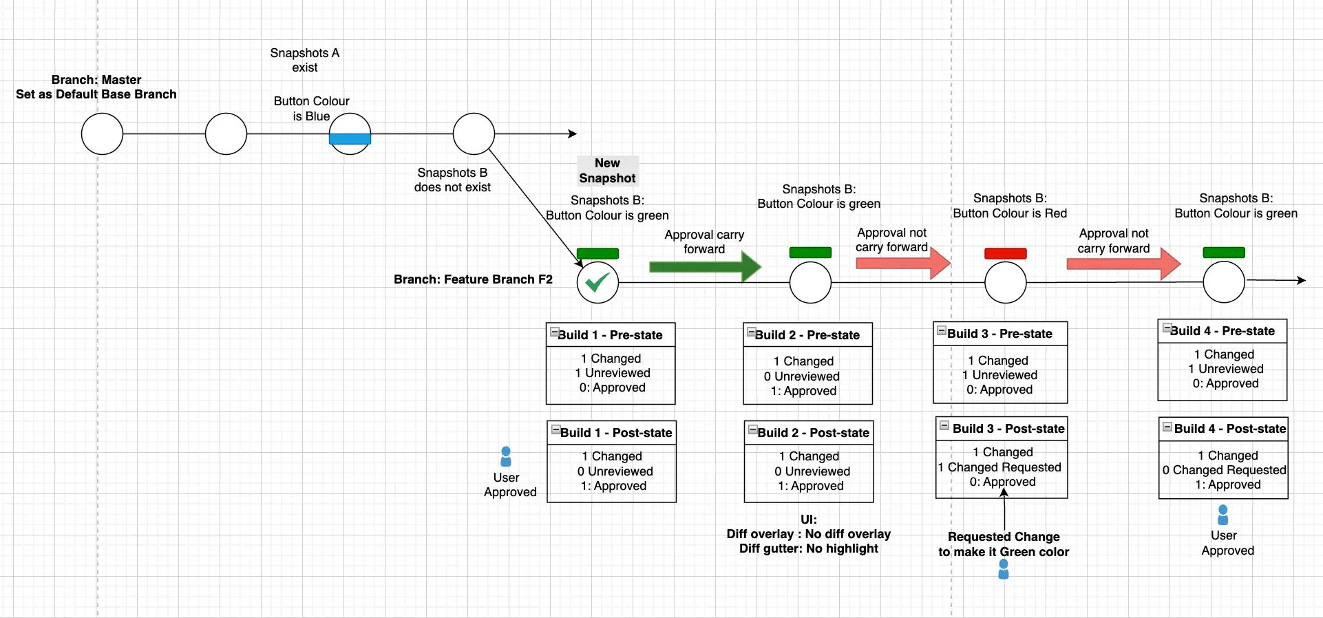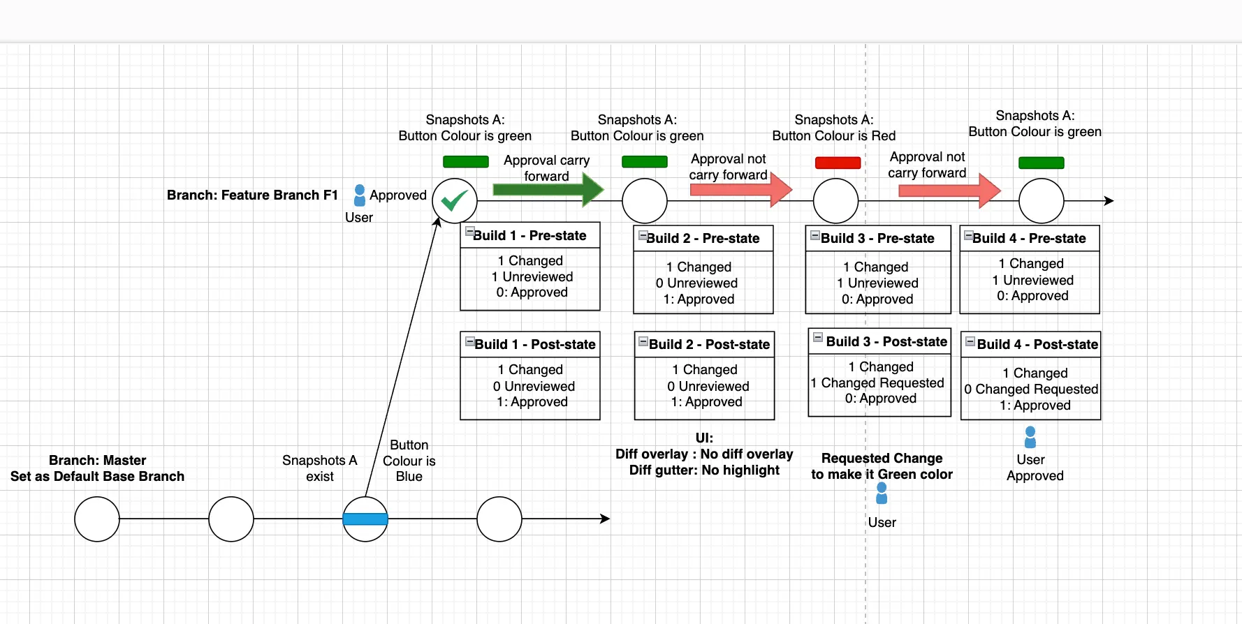 - Now, let’s say you create another build, Build 3 in which the button color changes from green to red. This snapshot has a change that is not approved in Build 2 in F1 and in the base build in the main branch. In this case, the approval is not carried forward.