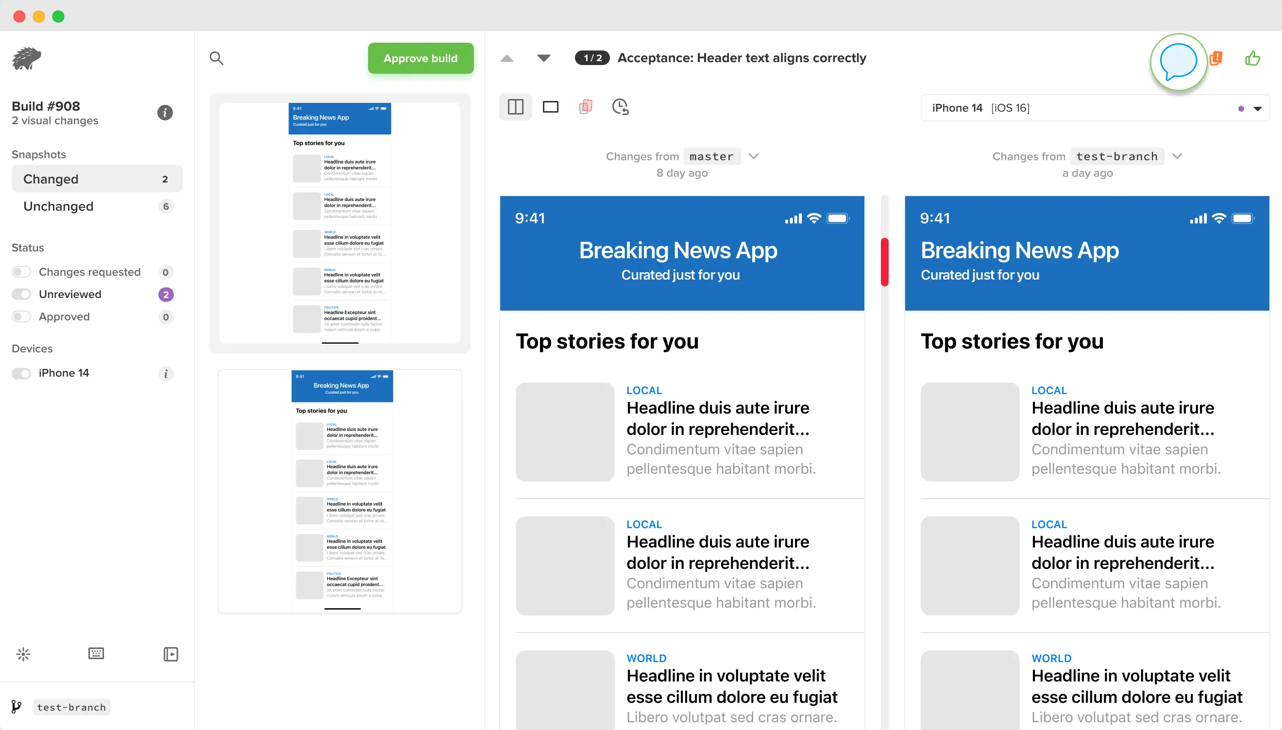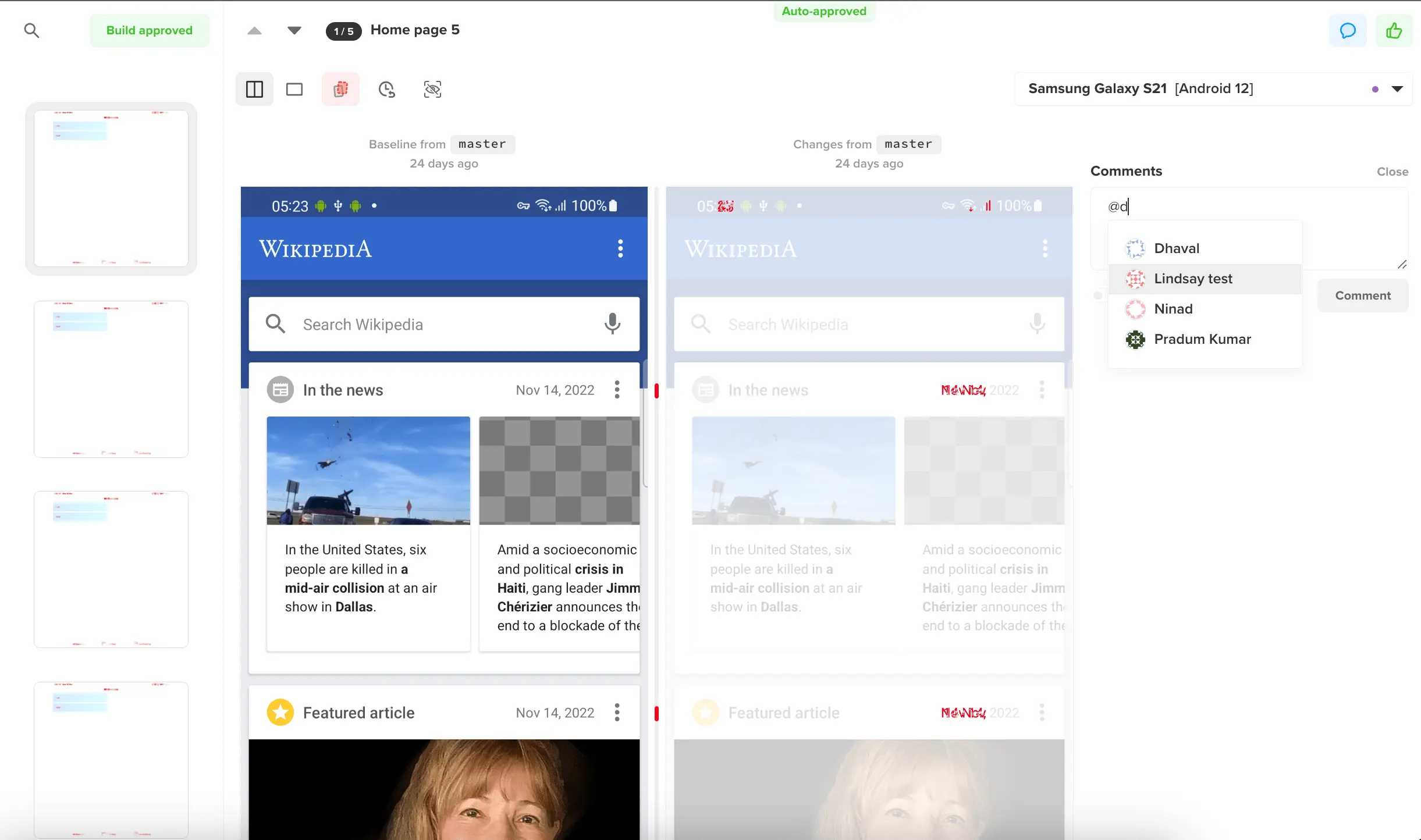 App Percy allows faster collabotation by adding comments to the visual reviews. Leave notes for your team mates on your observations. App Percy also sends email notifications when such comments are added.