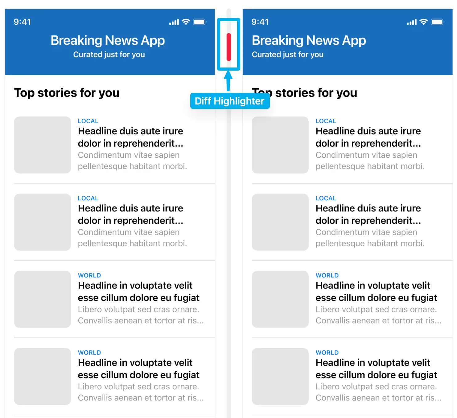 The diff highlighter is a static bar alongside a new image showing where changed areas are located. Very small changes or elements that match the diff overlay color may be difficult to spot. The highlighter can help identify where differences are at quick glance instead of having to zoom in or enable the diff overlay.