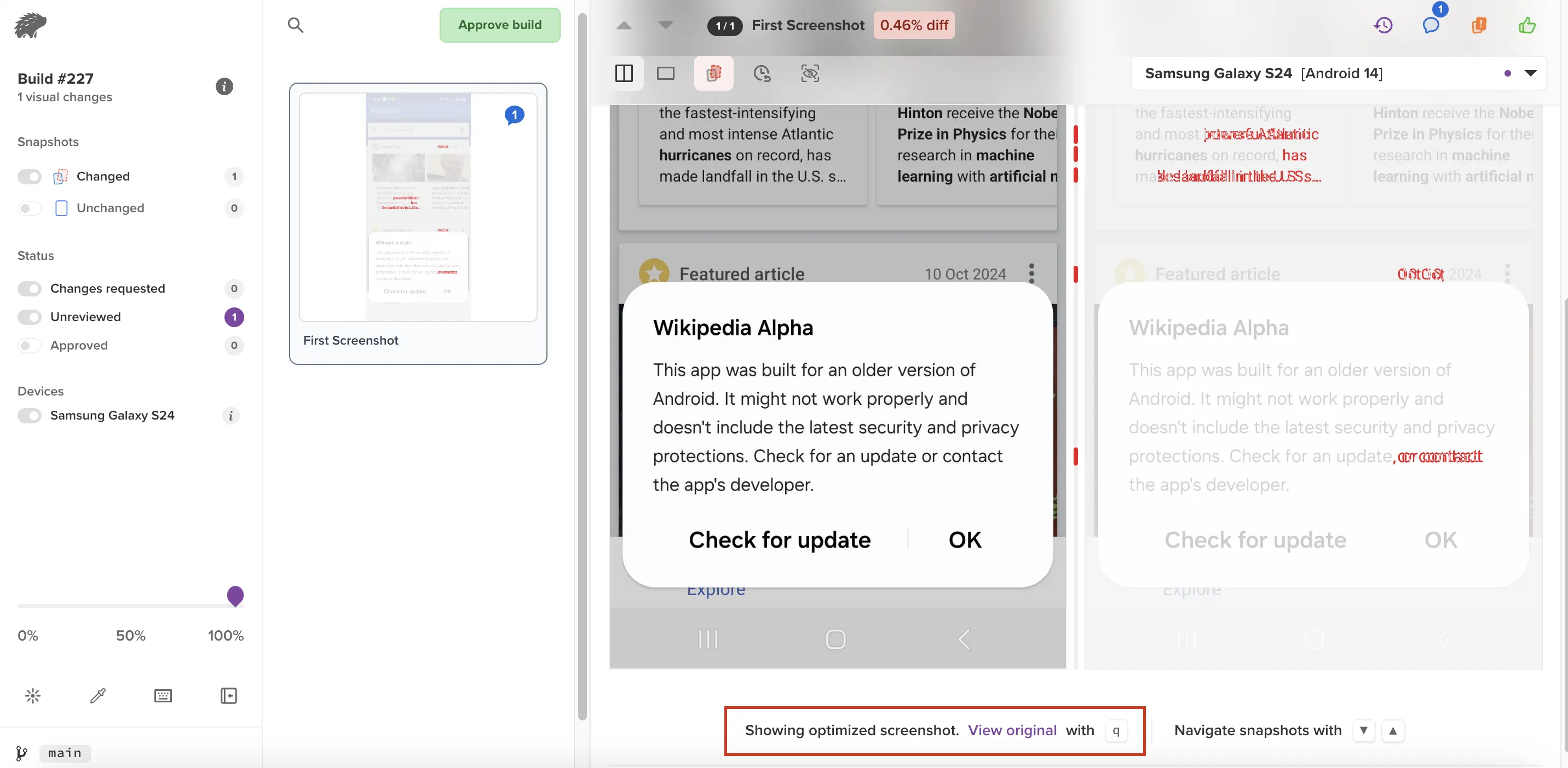 After enabling the View optimized images toggle, you will see the optimized screenshots used for build results comparison. You can view the original by pressing the q key.