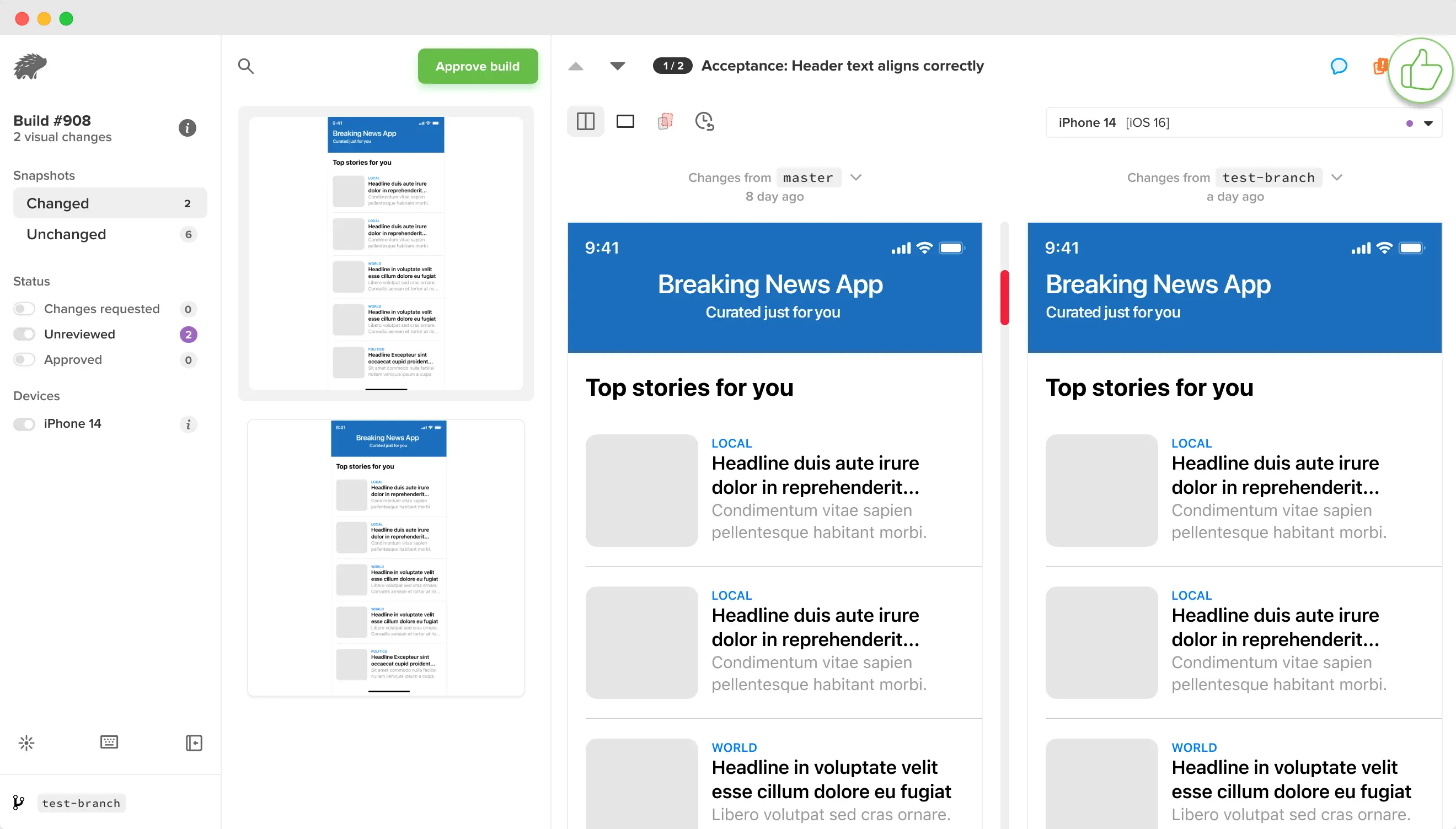 When matching diffs are detected, they are grouped together at the top of your snapshot list. With a single click, you can approve or request changes for all matching snapshots. While you can expand the group to inspect individual snapshots, approving or requesting changes for individual snapshots within a group is not possible. Additionally, requesting changes for a group automatically adds a “changes requested” comment to each grouped snapshot.