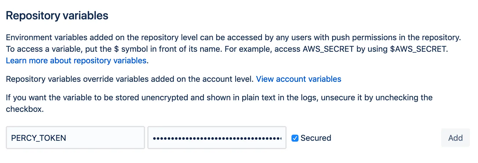 Bitbucket Pipelines provide a variety of ways to configure environment variables. Because each Percy project is usually associated with just one repository, we recommend setting PERCY_TOKEN up as a repository variable, and making it secure.