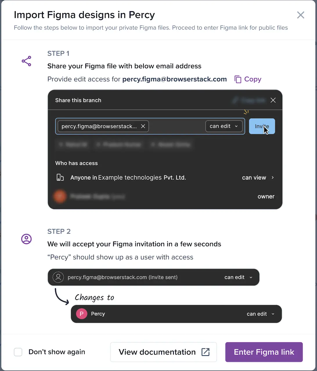 - For critical builds, grant Dev or Full access to our Figma service account (percy.figma@browserstack.com) to avoid rate limits and allow builds to complete.