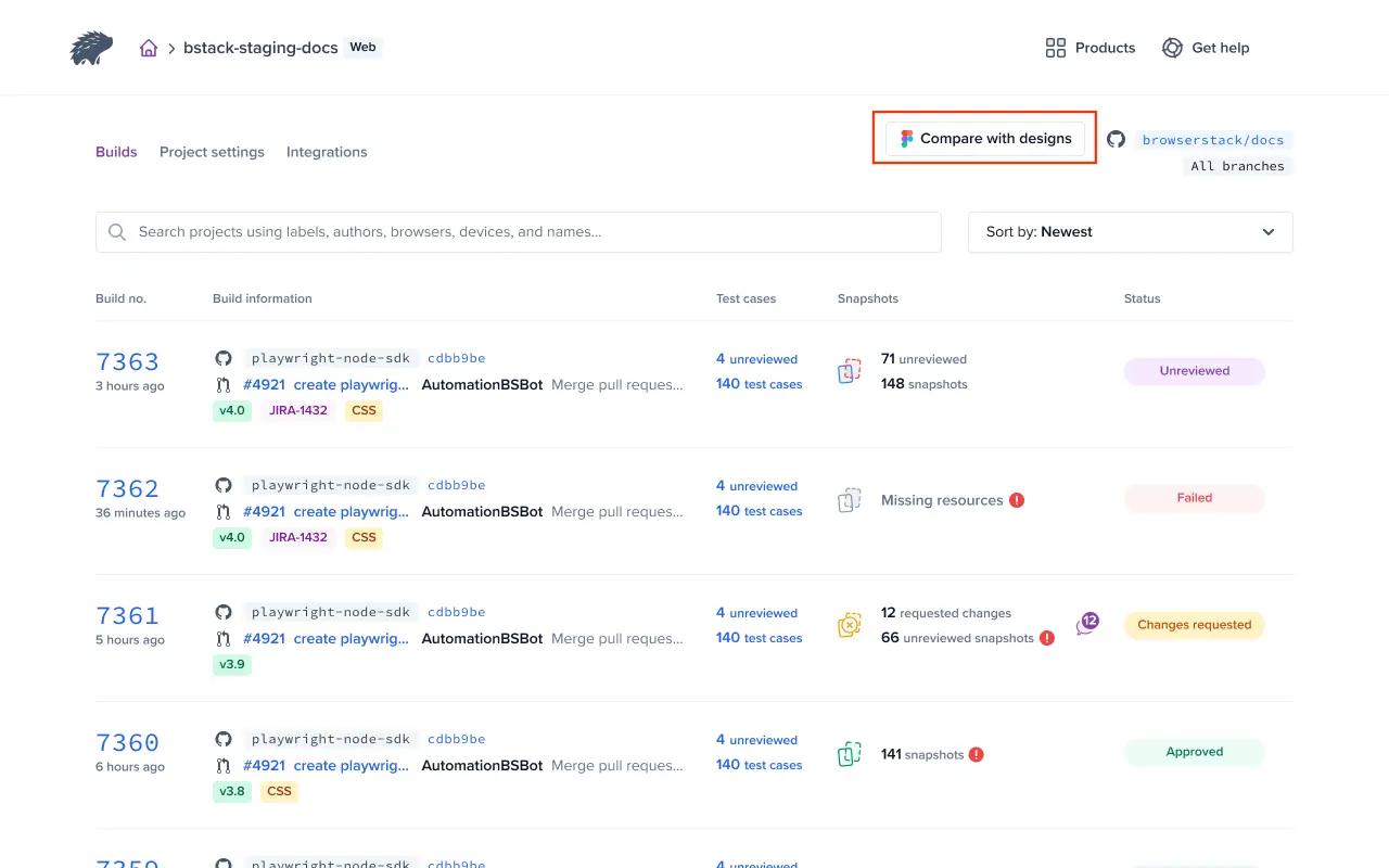 A new build is triggered for the imported Figma designs. By default, the first Figma build is auto-approved. The next time you trigger a build, the review page displays snapshots for comparison.
