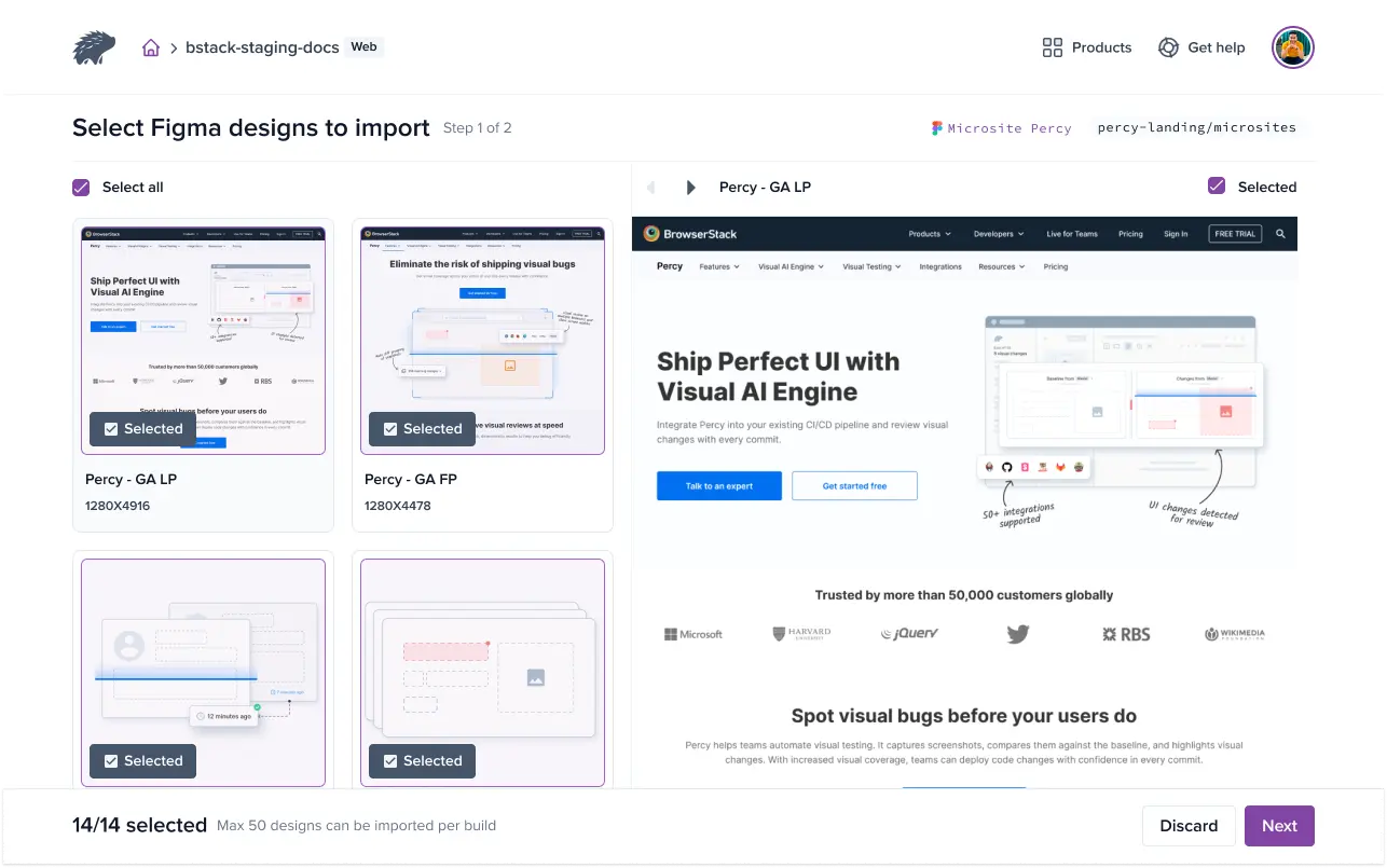 Step 5: Select the desired Figma designs. By default, the system pre-selects the first 50 imported designs.