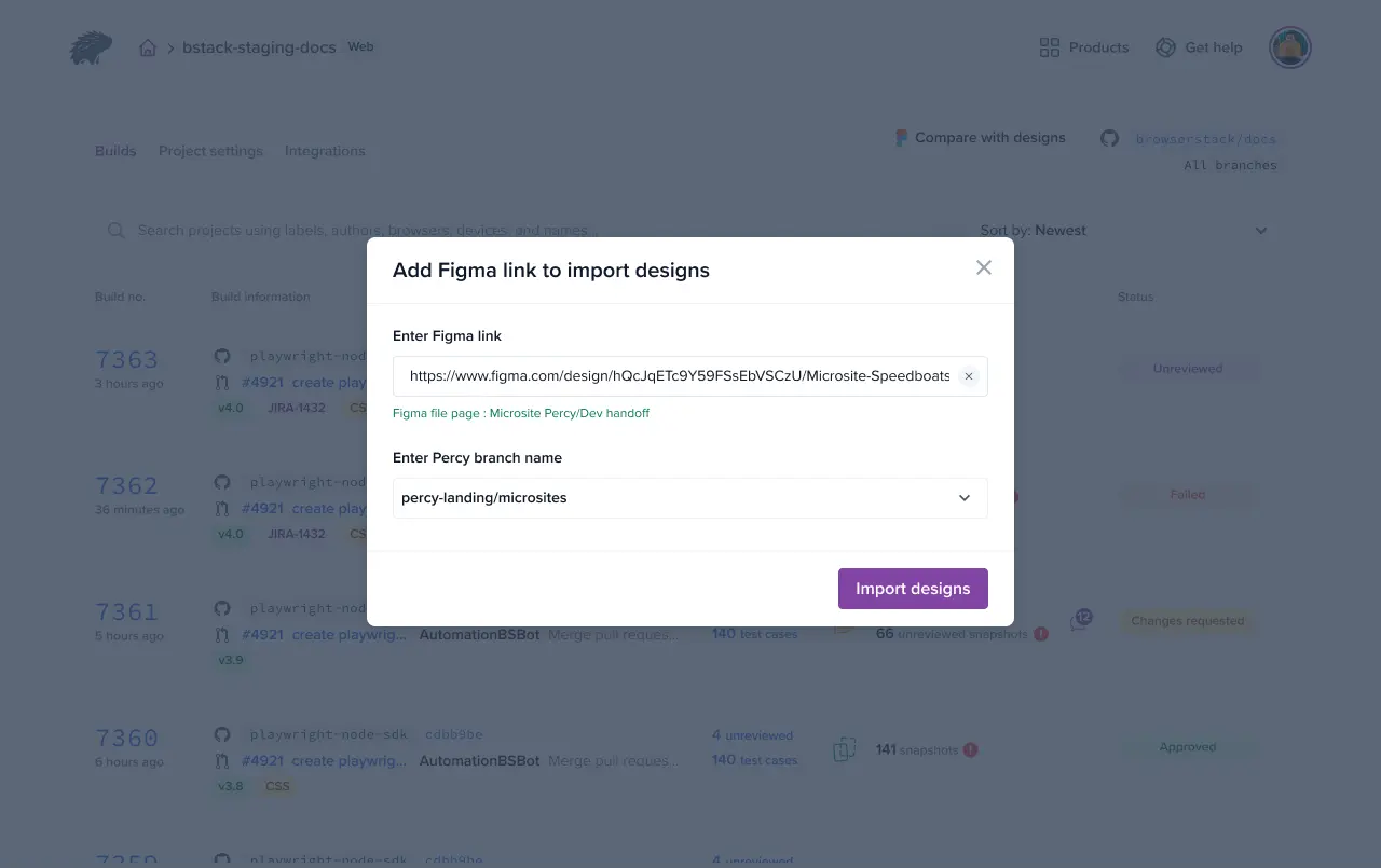 Step 3: Enter the Figma link to import your designs. Enter a App Percy branch name. You can select an existing branch name from the drop-down or create a new one.