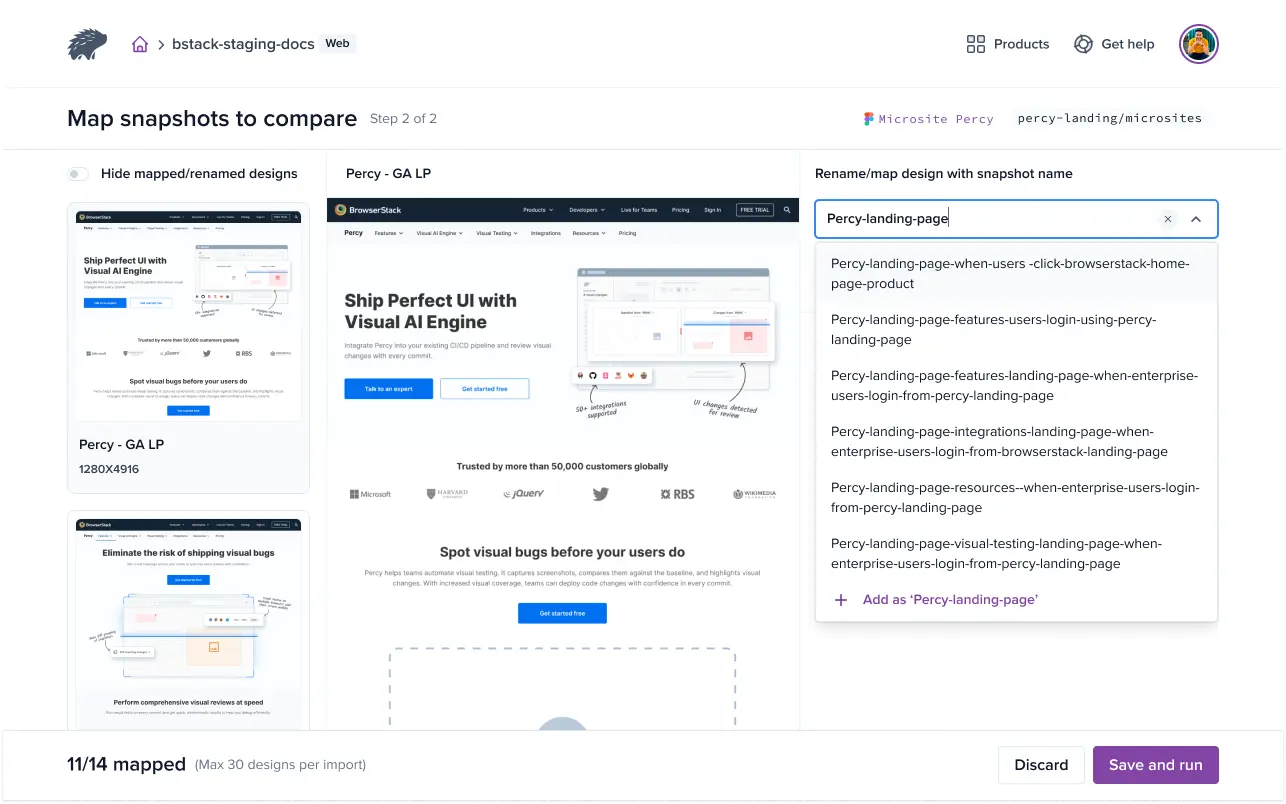 Step 6: Rename or map your design to a snapshot name for comparison. You can either select an existing snapshot name from the list or provide a new one. Optionally, enable the Use design name as snapshot name checkbox to automatically map snapshots. If no snapshot name is provided, Percy defaults to using the design name as the snapshot name.