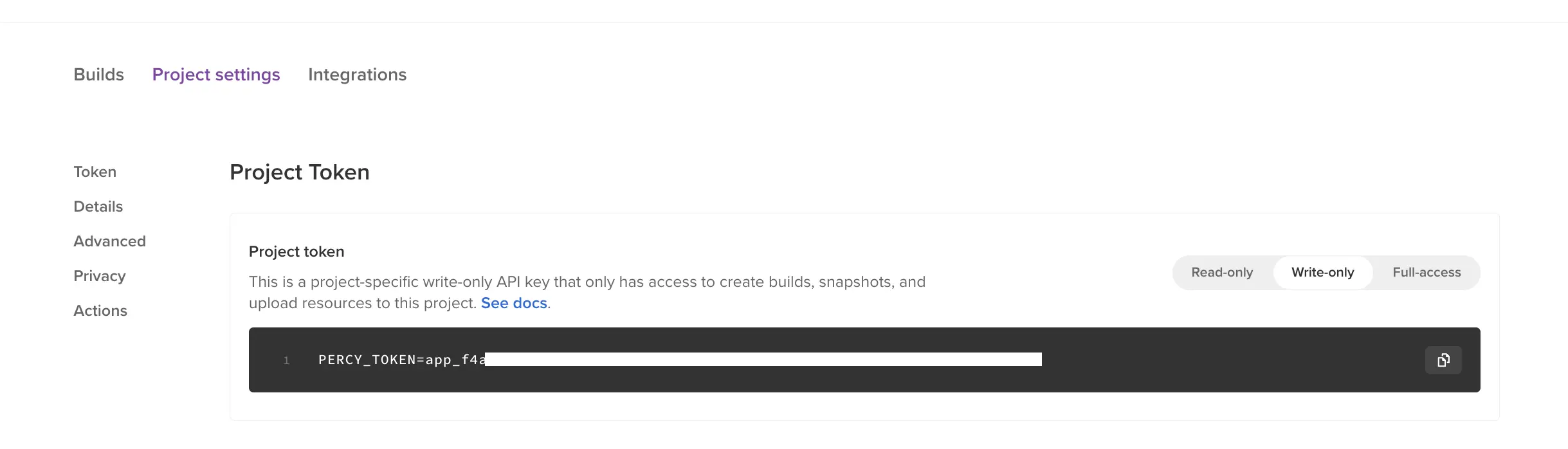 A Percy token is generated when you create an App Percy project. The token is a write-only API key that is unique for each project. You can find this on the Project Settings page.