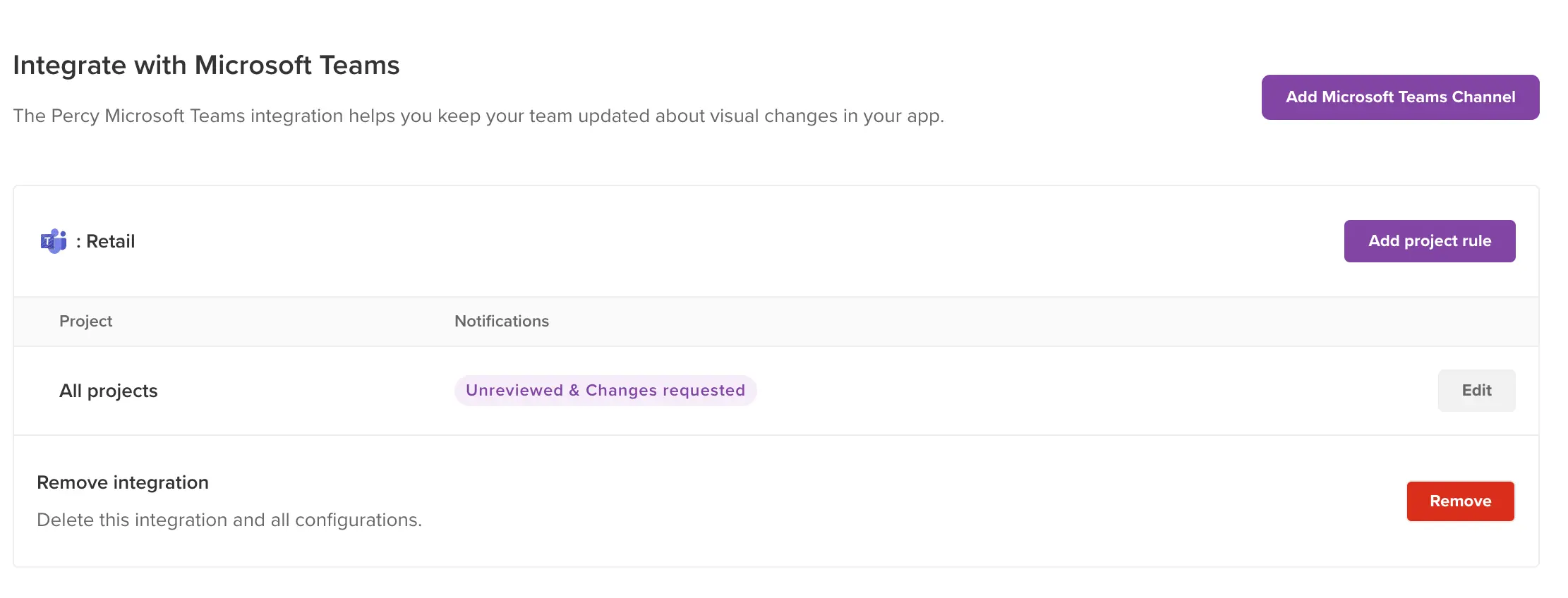 Your Microsoft Teams integration will show up as below on the App Percy Integrations page.