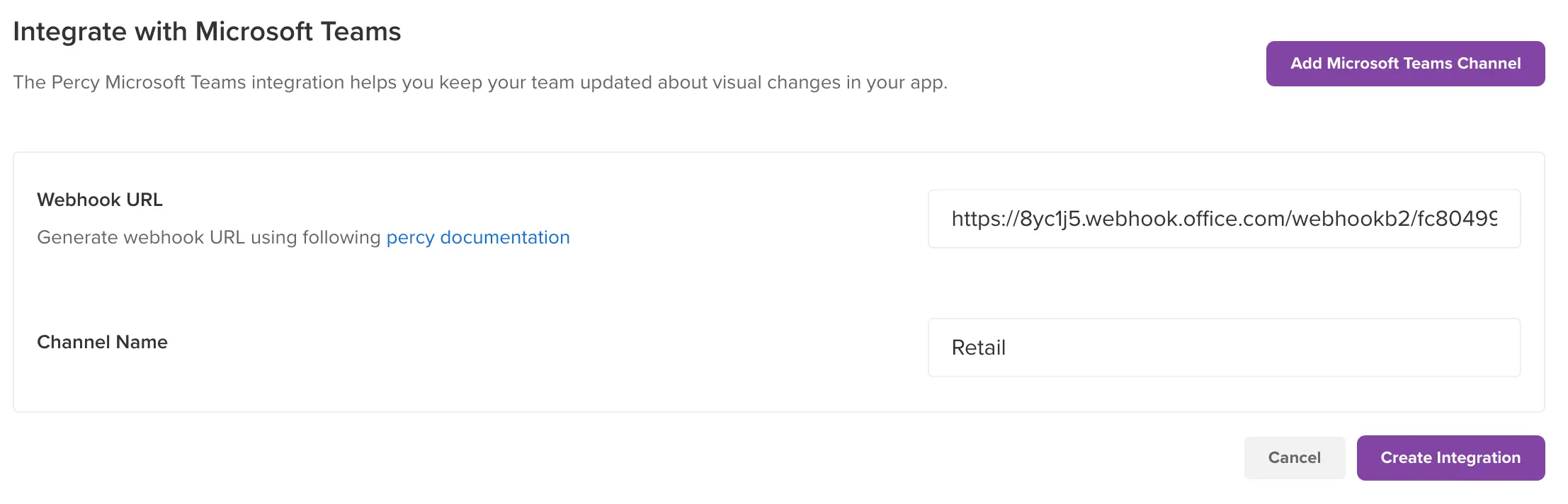 - Go to the Integrations page (you can access this either from both the main organization page or from within a specific project), and click Connect for Microsoft Teams. You’ll be directed to a Microsoft Teams authorization page giving App Percy permission to connect to a Microsoft Teams channel.