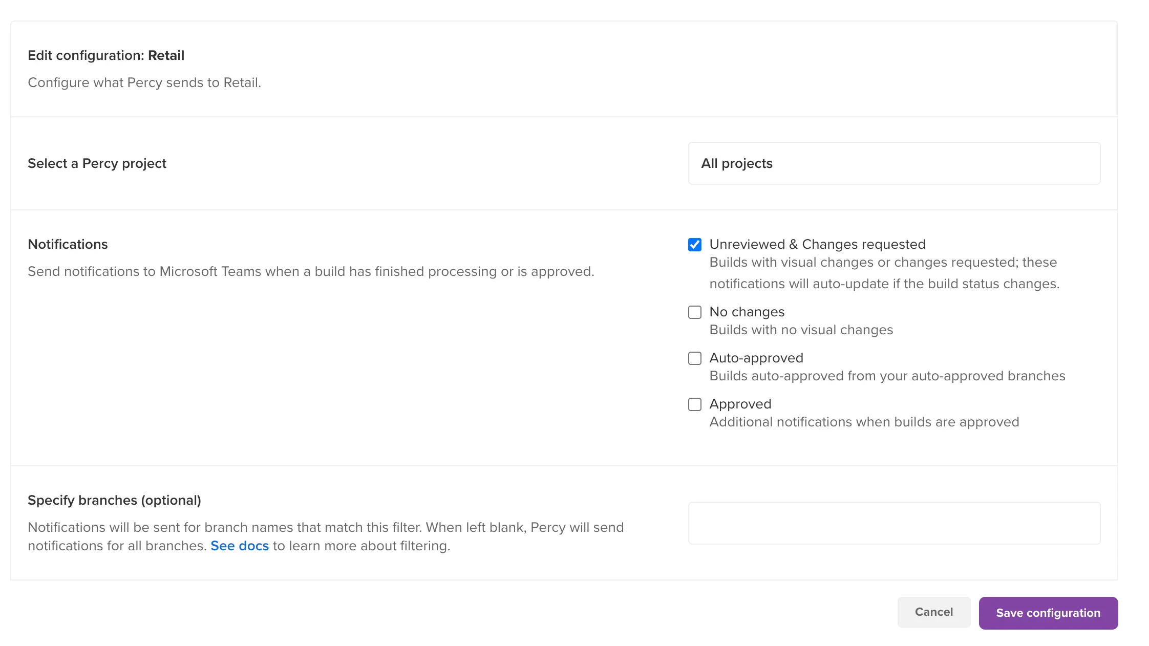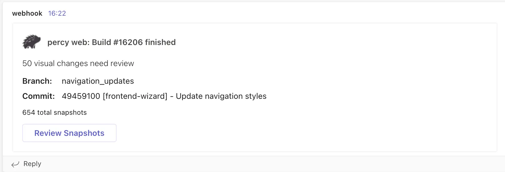 You can choose to receive different notifications for a App Percy build in Microsoft Teams. The following is the list of notifications that are currently supported: