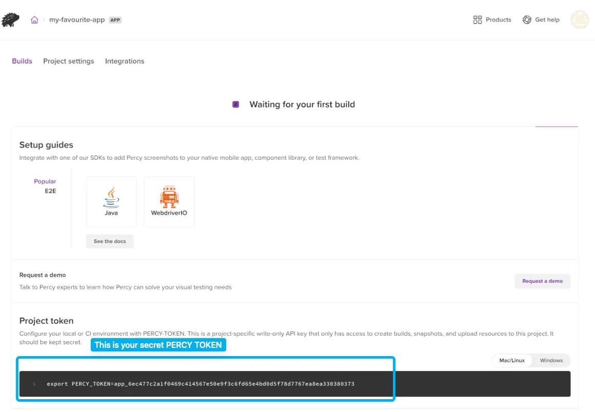 Sign in to Percy and create a new app project, for example, test-project. After you’ve created the project, you’ll be shown a Percy Access Token. Use it in the next step.