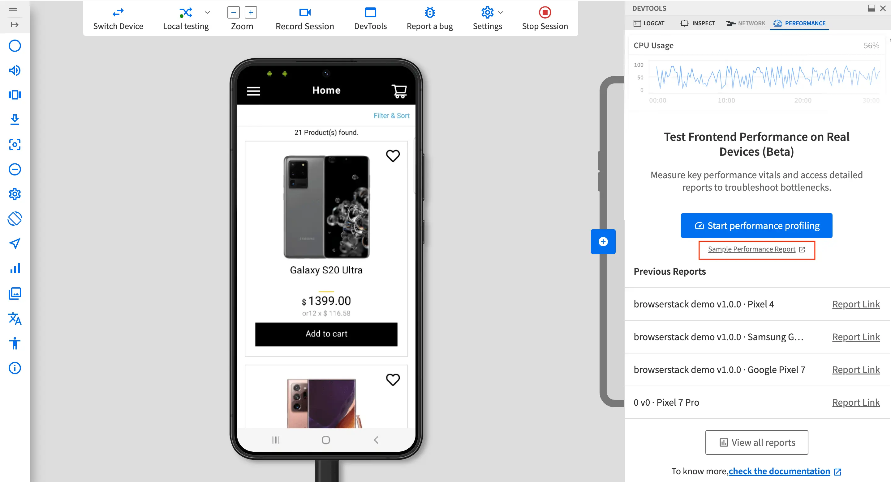 5. If required, before starting app profiling, click Sample Performance Report. A sample PDF of the app performance report will open in a new browser window. This lets you preview the insights you will gain from the profiling process. The PERFORMANCE tab with the Sample Performance Report link highlighted by a red box
