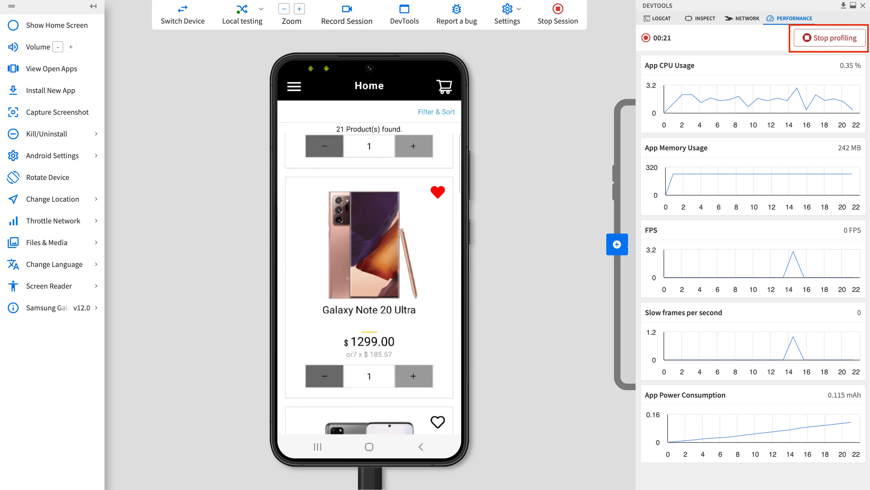 6. Click Start performance profiling. The performance profiling of your app starts.