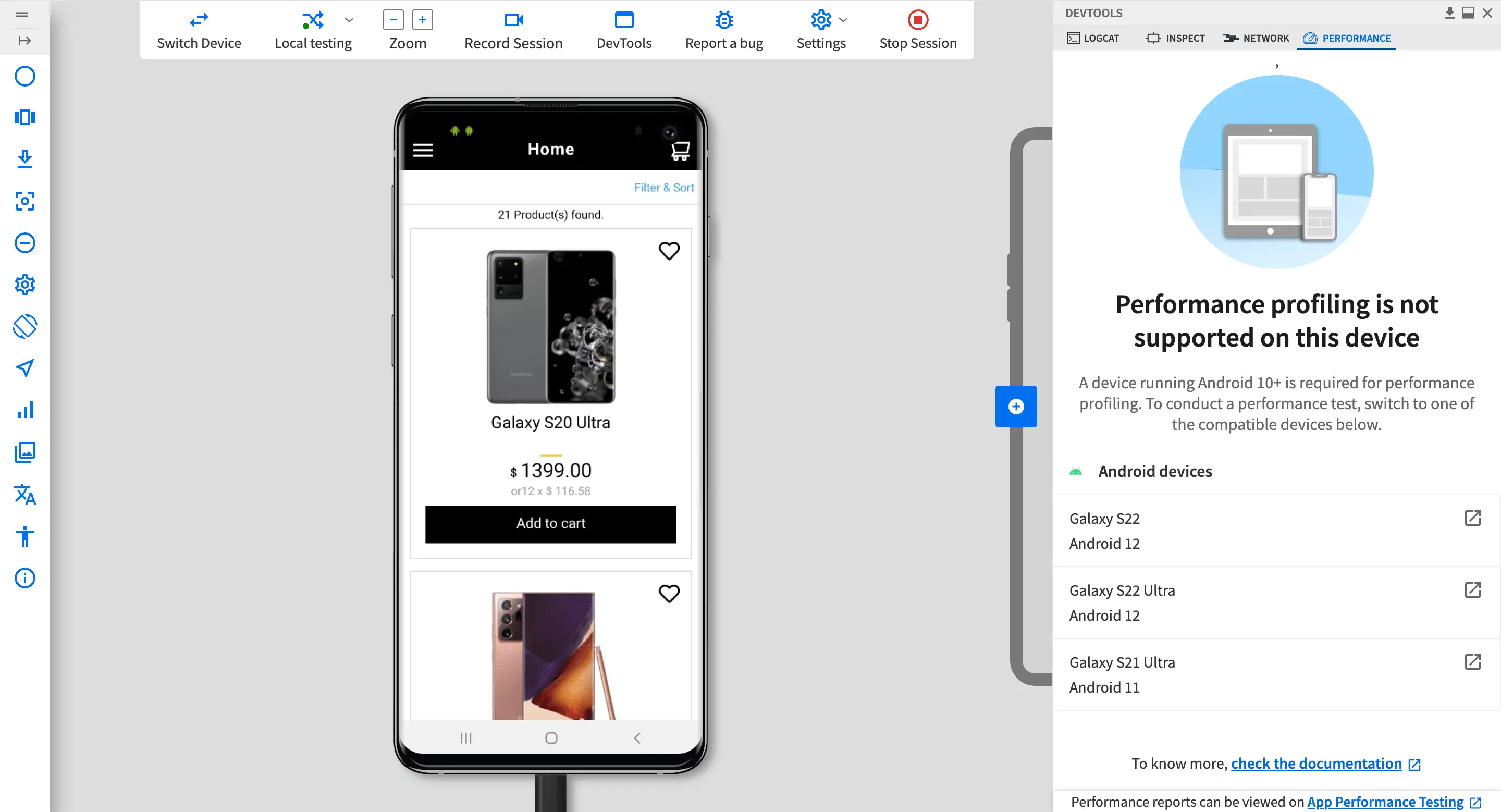 4. If you are using an unsupported version, the PERFORMANCE tab displays a list of Android and iOS compatible devices. You can switch to a compatible device from the list. The PERFORMANCE tab indicating the device is unsupported and displaying a list of compatible Android and iOS devices. A dialog box appears prompting you to click Switch Device. A new session will then start for the new device you selected.
