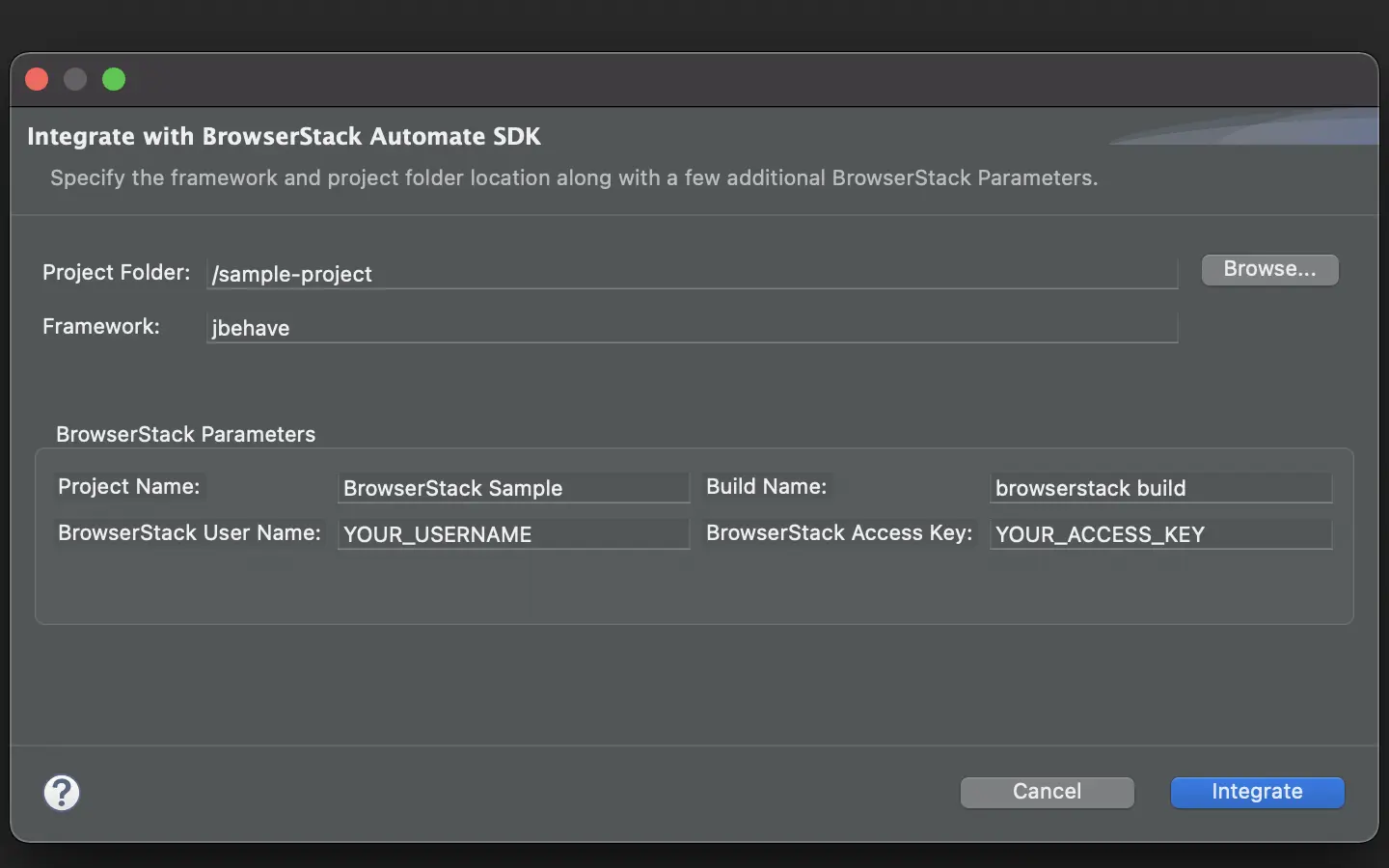 Select your Project Folder, Framework, and other BrowserStack Parameters, and then click Integrate.