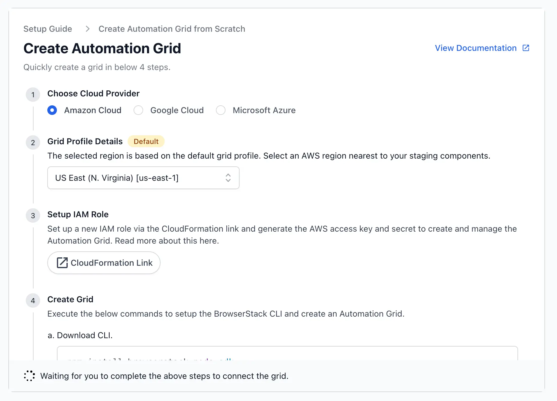 Use this document if you want to set up a browser automation grid from scratch. This document explains the steps required to create an IAM user and access key and secret with relevant permissions to create and manage a fully functional grid with dependent services using BrowserStack CLI.