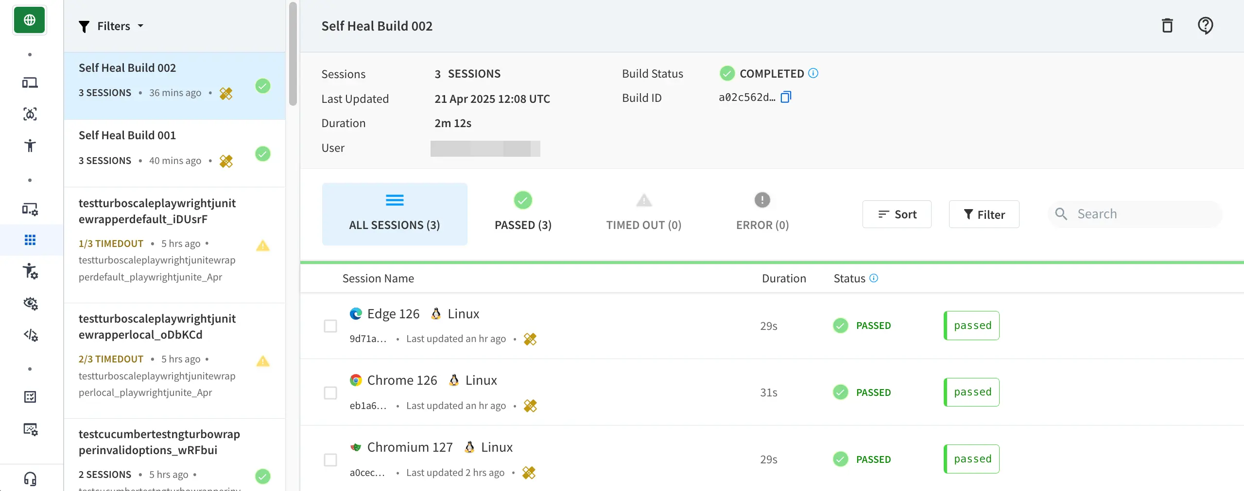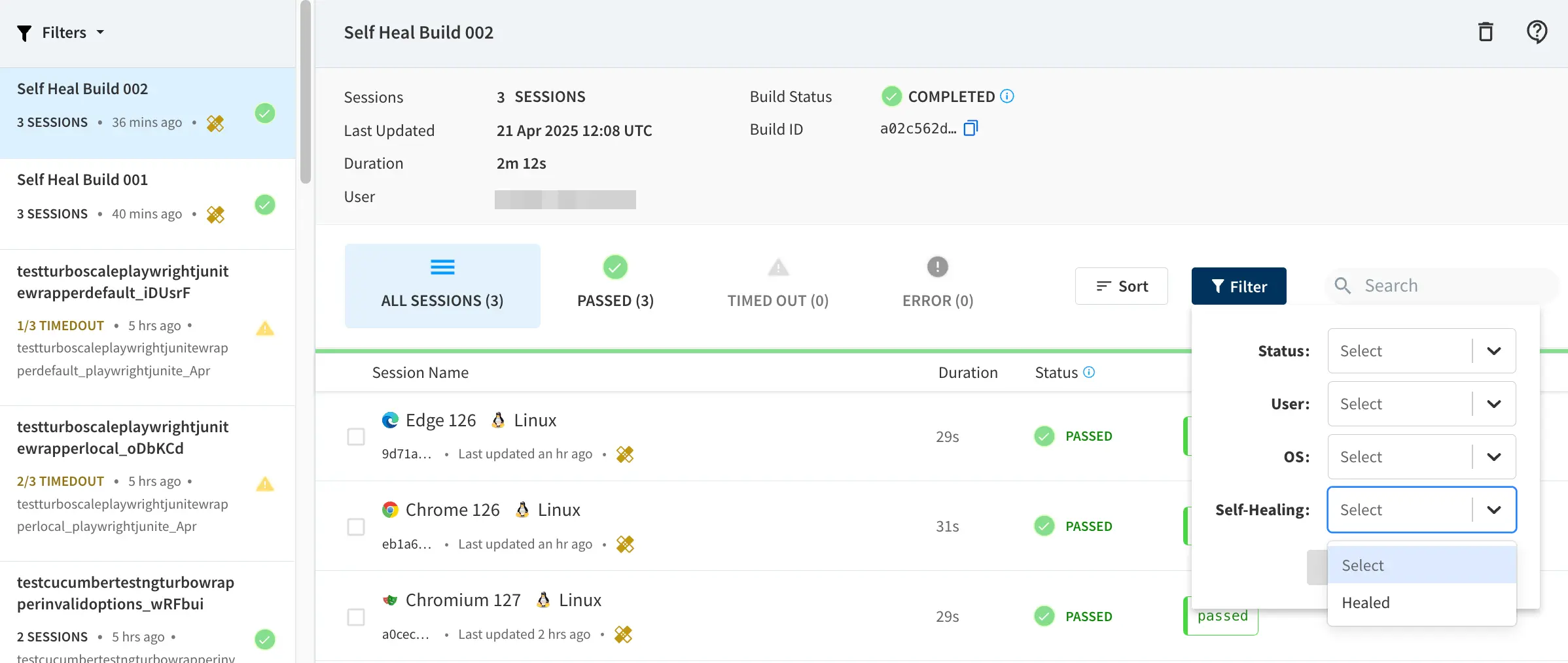 You can also filter your self-healed sessions using the sessions filter and selecting the Healed option under Self-Healing dropdown.