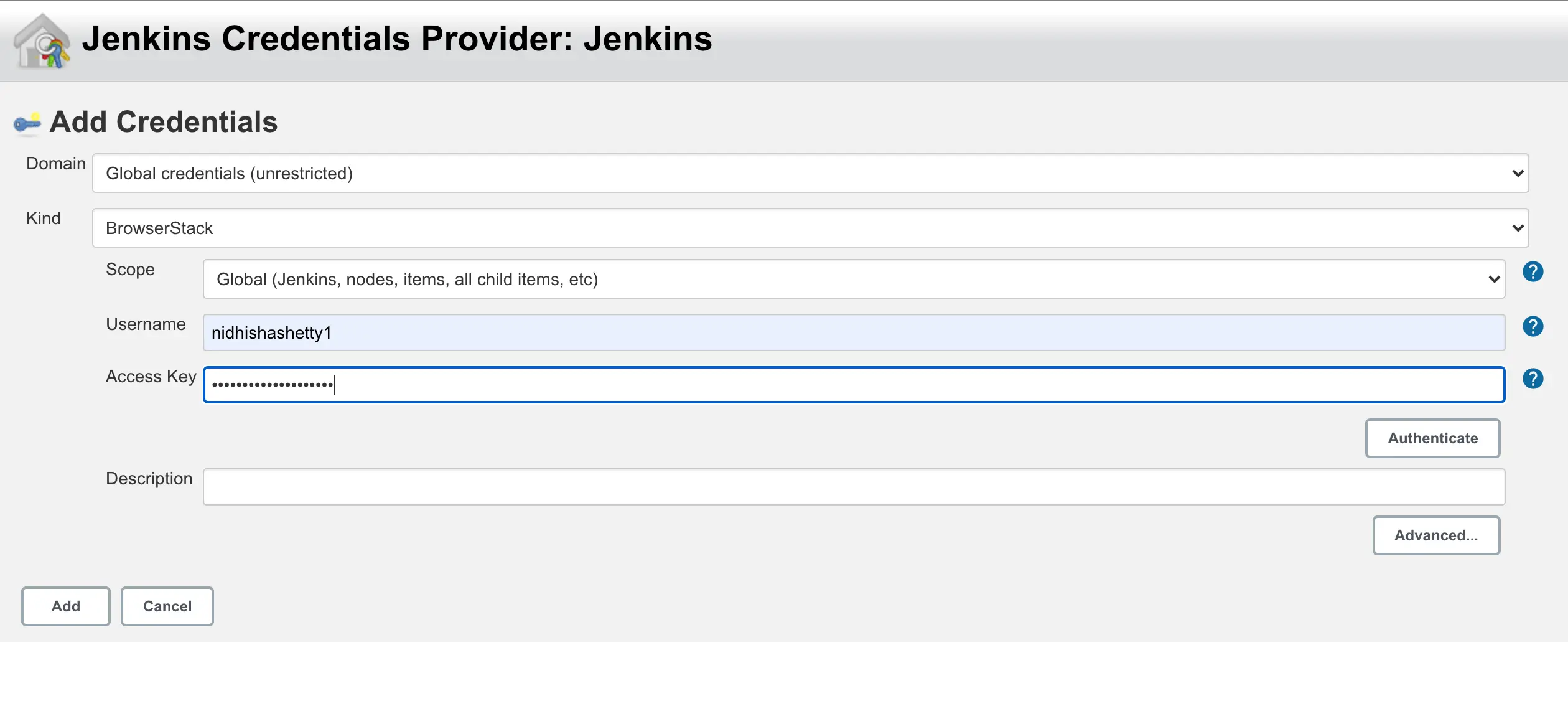 - Add your BrowserStack username and access key in Jenkins Credentials Provider: Jenkins window and click Add as shown below: