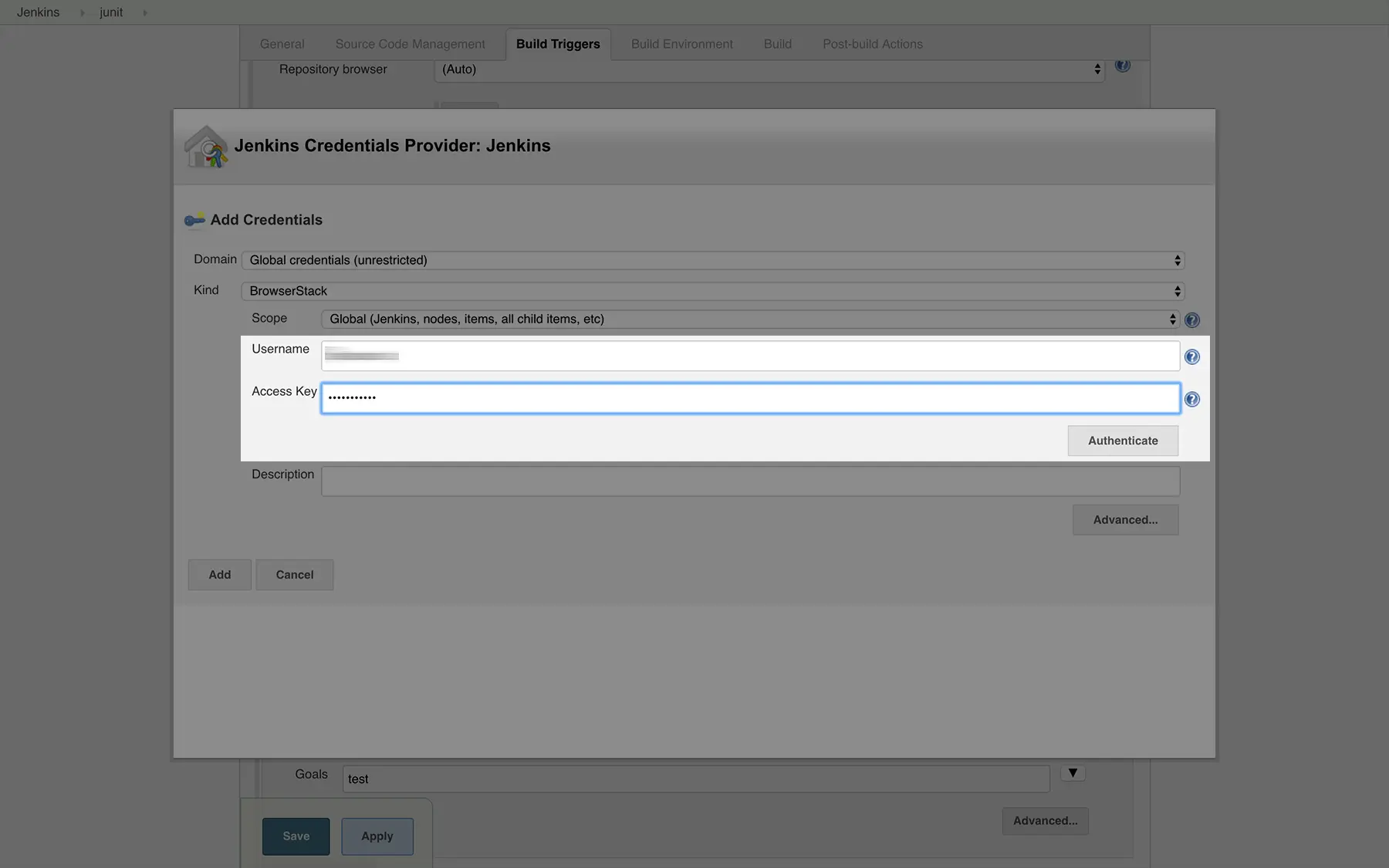 - Configure your BrowserStack credentials for your Jenkins jobs.