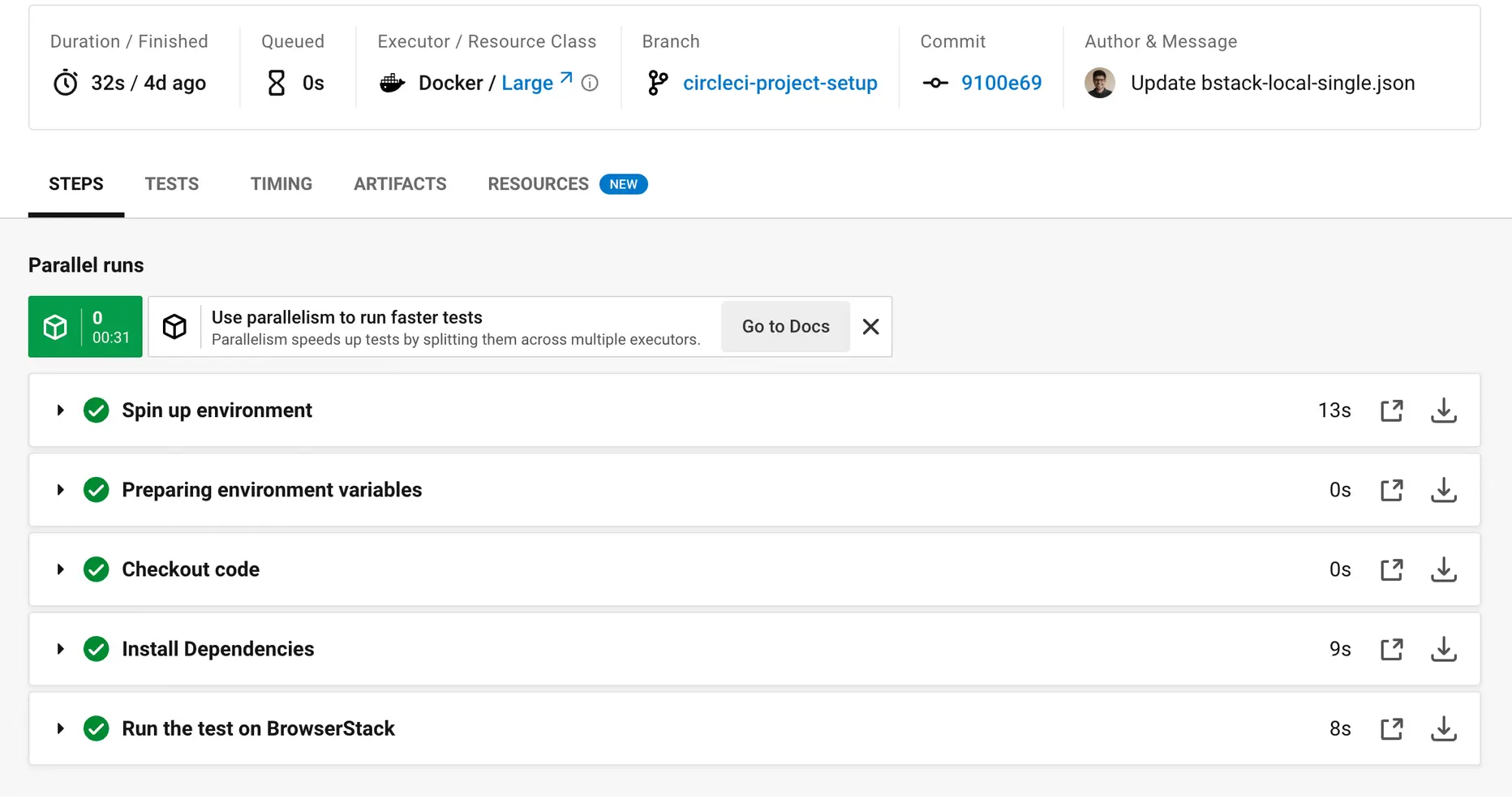 config.ymlas per your needs. Here is an example configuration for your reference which can be used to run your cypress tests using the BrowserStack Cypress CLI: You don’t have to install Cypress or any of the npm packages on your CI machine. We automatically install them on our machines before running the test.config.ymlversion: 2.1 jobs: build: docker: - image: cimg/node:14.11.0 working_directory: ~/app steps: - checkout - run: name: "Install Dependencies" command: sudo npm install -g browserstack-cypress-cli - run: name: "Run the test on BrowserStack" command: browserstack-cypress run workflows: build: jobs: - build - Once your pipeline runs successfully you will see that the build has passed when you navigate to the CircelCI dashboard.