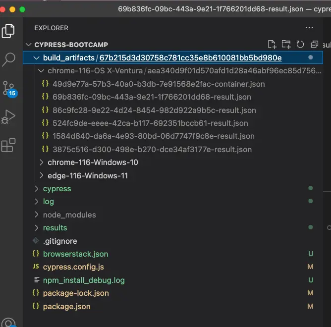 ./resultswithin thedownloadssettings ofbrowserstack.json, then the folder structures have been downloaded after your build finishes on BrowserStack. You need to run the mochawesome-merge utility now using the following command:npx mochawesome-merge "build_artifacts/<build-id>/*/results/*.json" > mochawesome.json - Once the merged JSON is created, you can run the next command to create the single HTML report:
