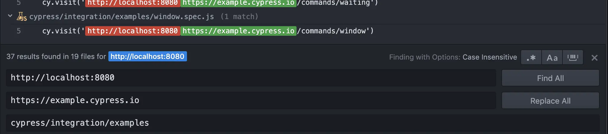 Step 7: Search the project for http://localhost:8080, and then replace all instances with https://example.cypress.io as shown in the following IDE sample: