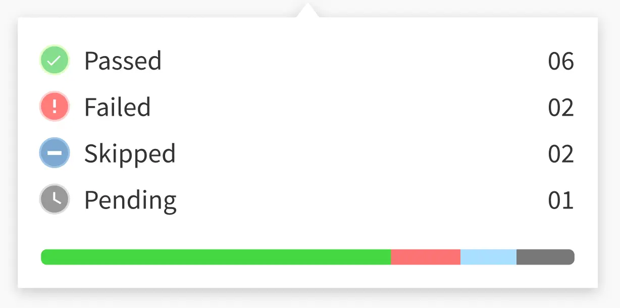 Execution Summary: Displays the total number of tests within the Spec. On hover, displays the number of tests marked as Passed, Failed, Pending, or Skipped.