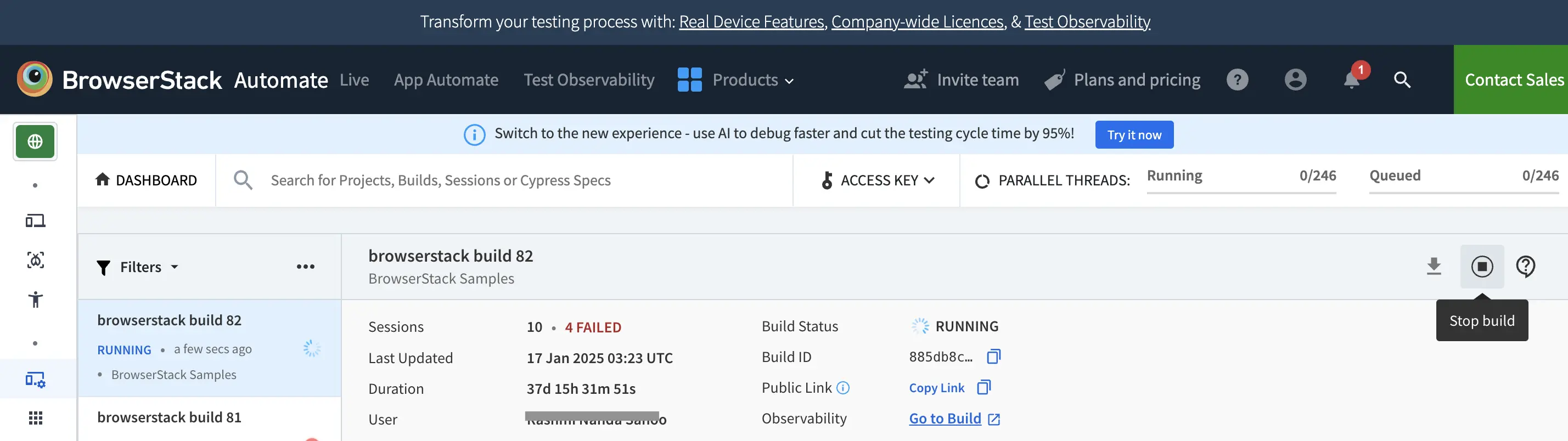 If a test run stops due to a crash, you can stop the build from running by clicking the Stop build option from the Automate dashboard.