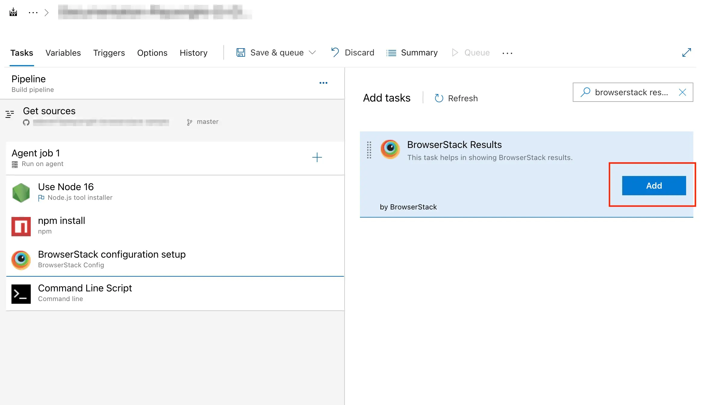 In the Tasks tab, click + on the Agent job 1 card to add the BrowserStack Results task.