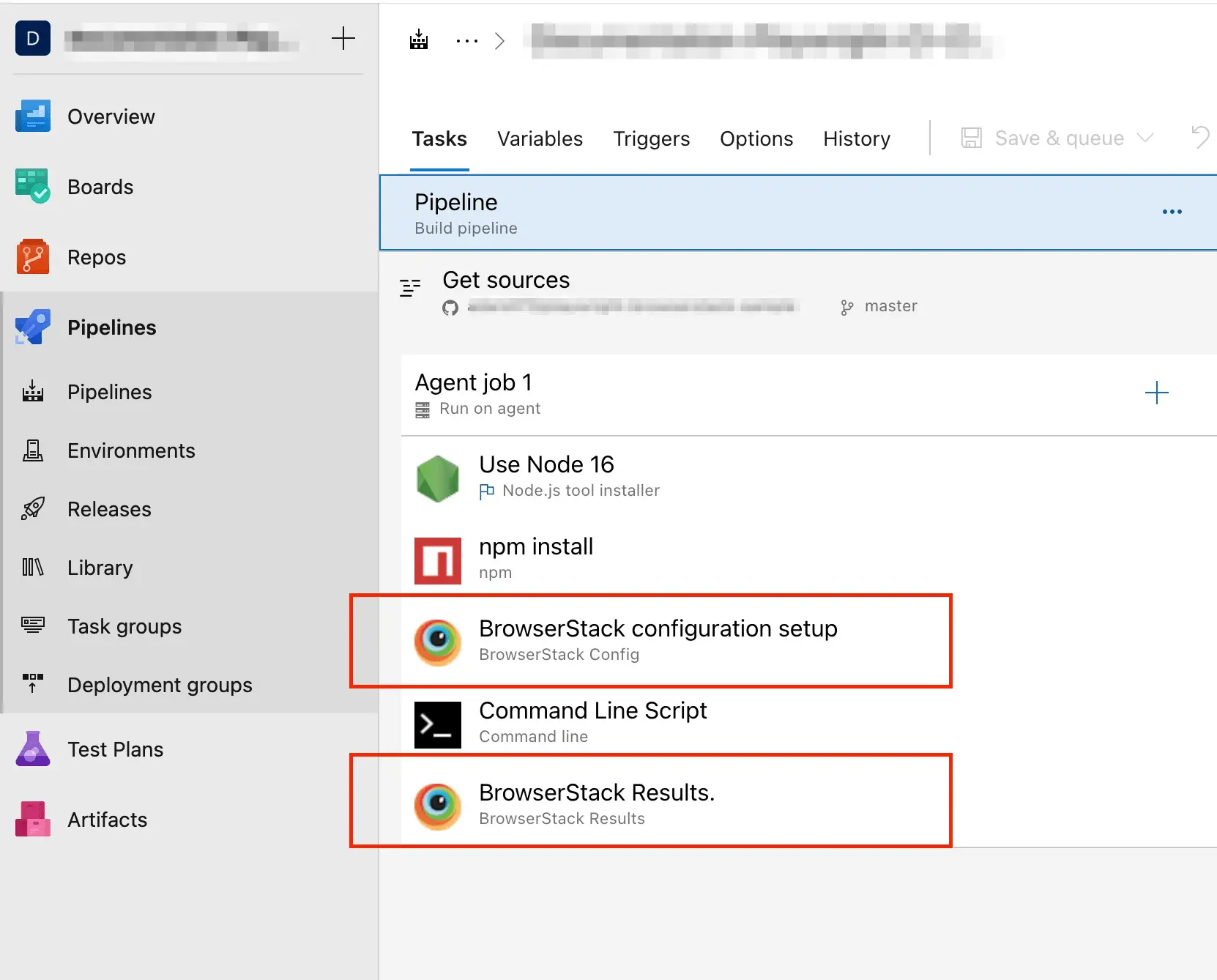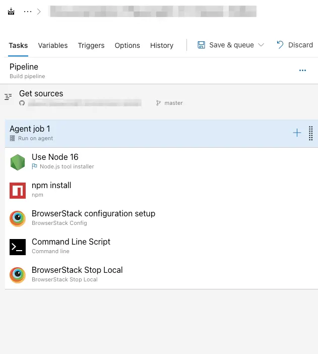 The following image shows all the BrowserStack tasks configured in the pipeline to run your test on BrowserStack.