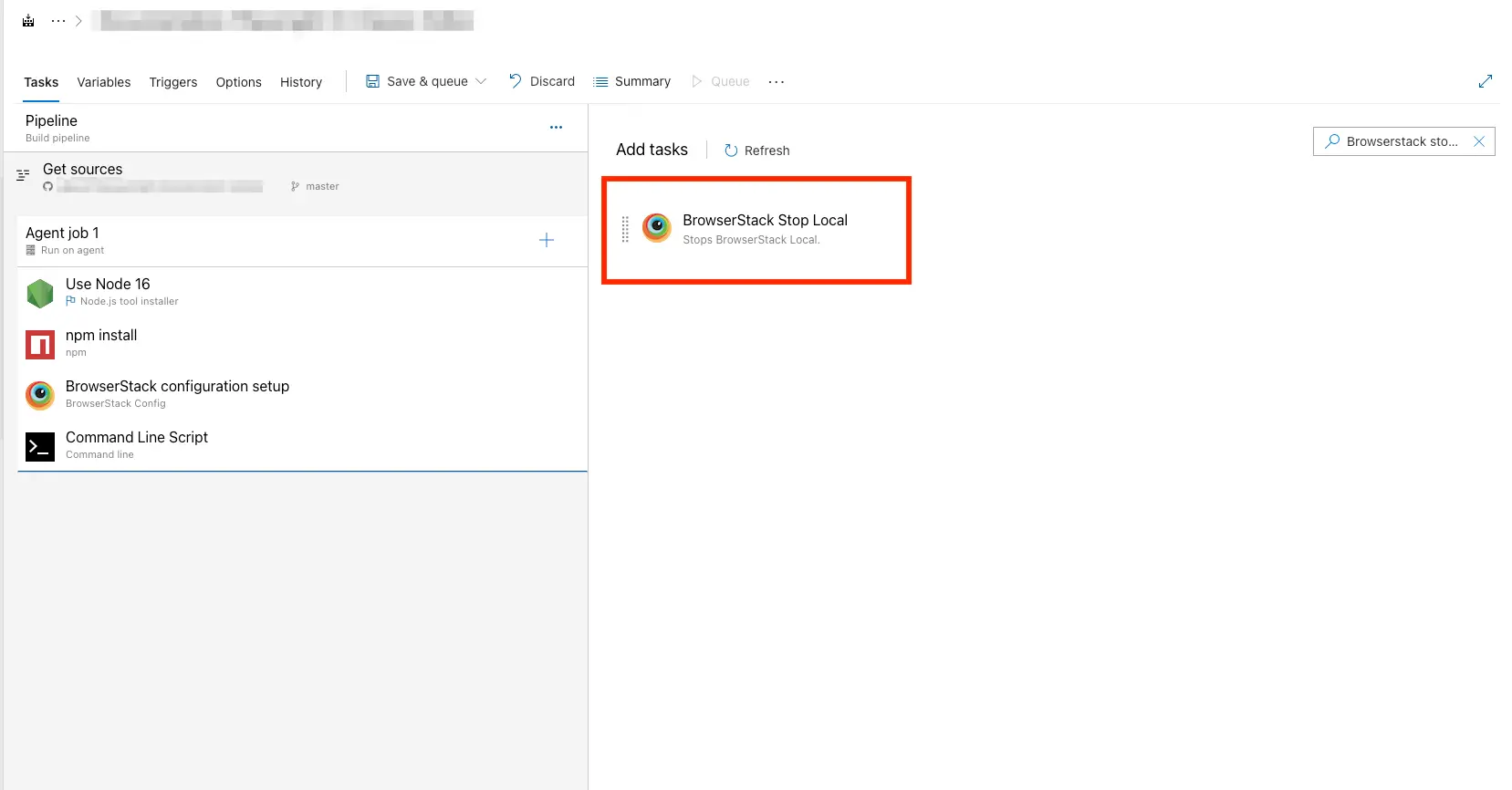 In the pipeline editor, from the Tasks pane, search for the BrowserStack Results task, and then select it.