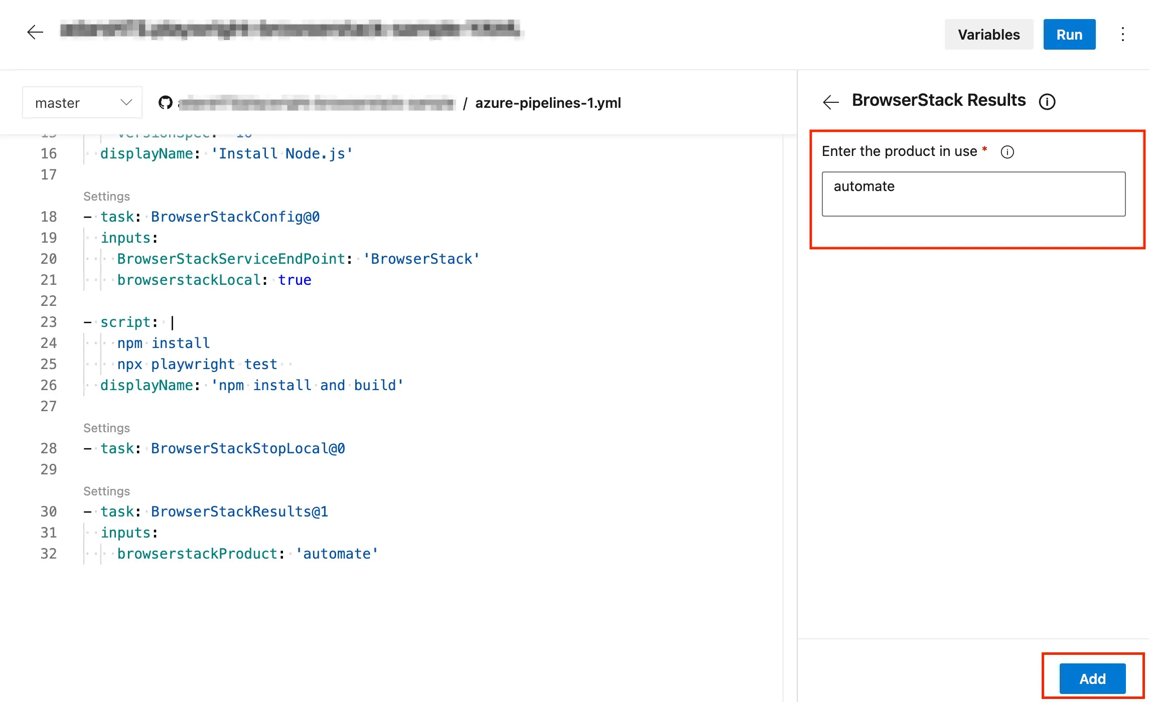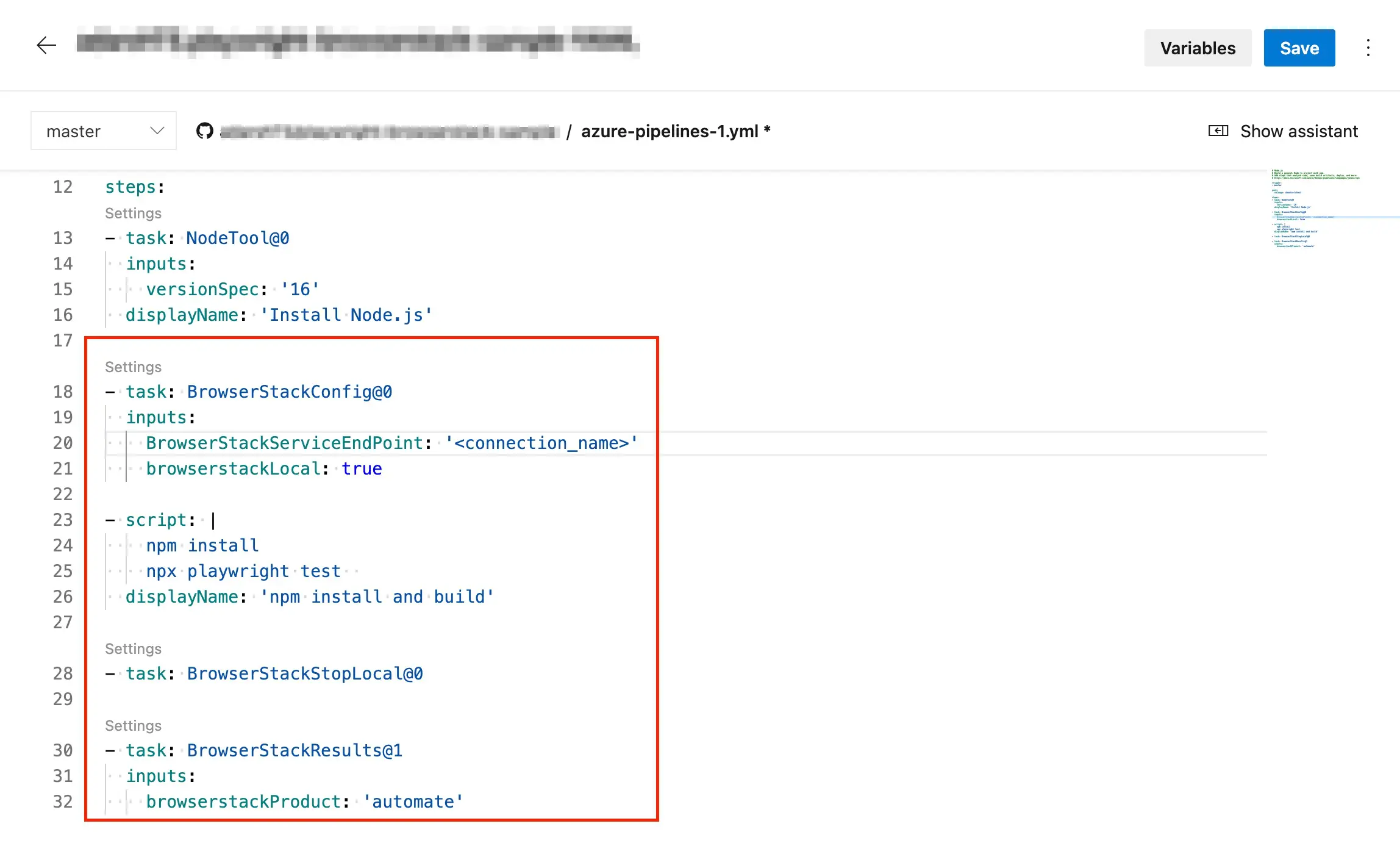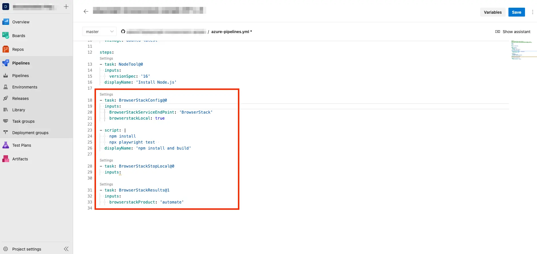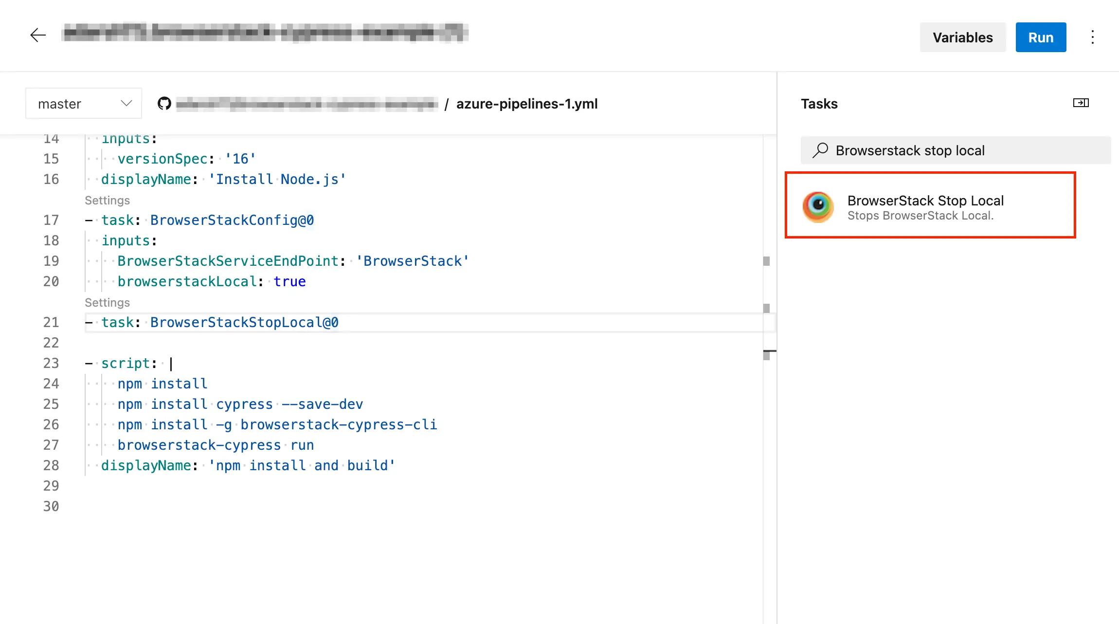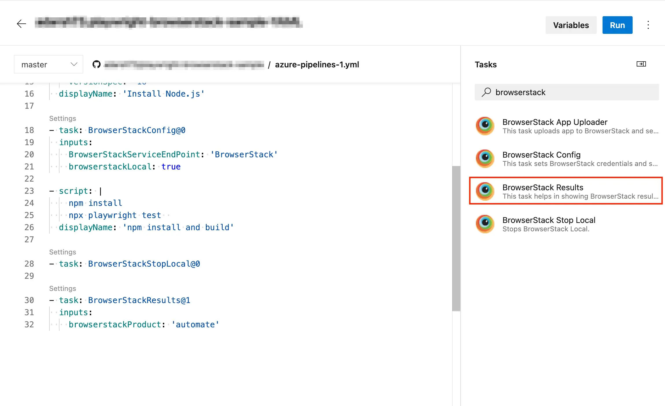The following image shows the azure-pipelines.yml file with all the BrowserStack tasks configured to run your test on BrowserStack.