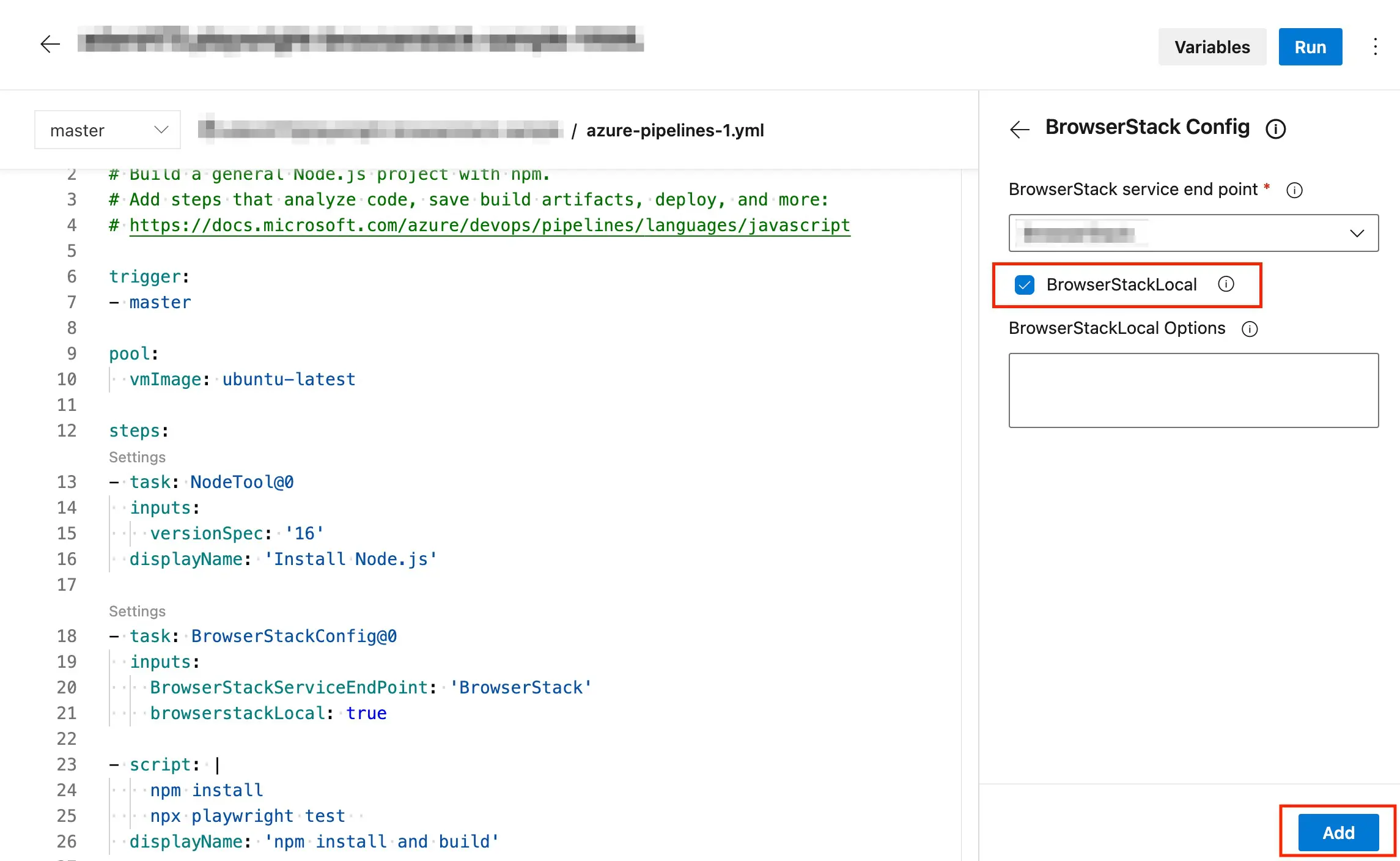 The following image shows the azure-pipelines.yml file with all the BrowserStack tasks and local configured to run your test on BrowserStack.