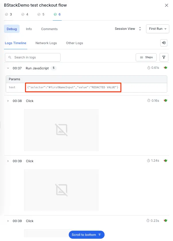 When the browserstack.maskCommands capability is used for the supported commands, all requested commands are replaced with REDACTED VALUE in your Text Logs or the Raw Logs.