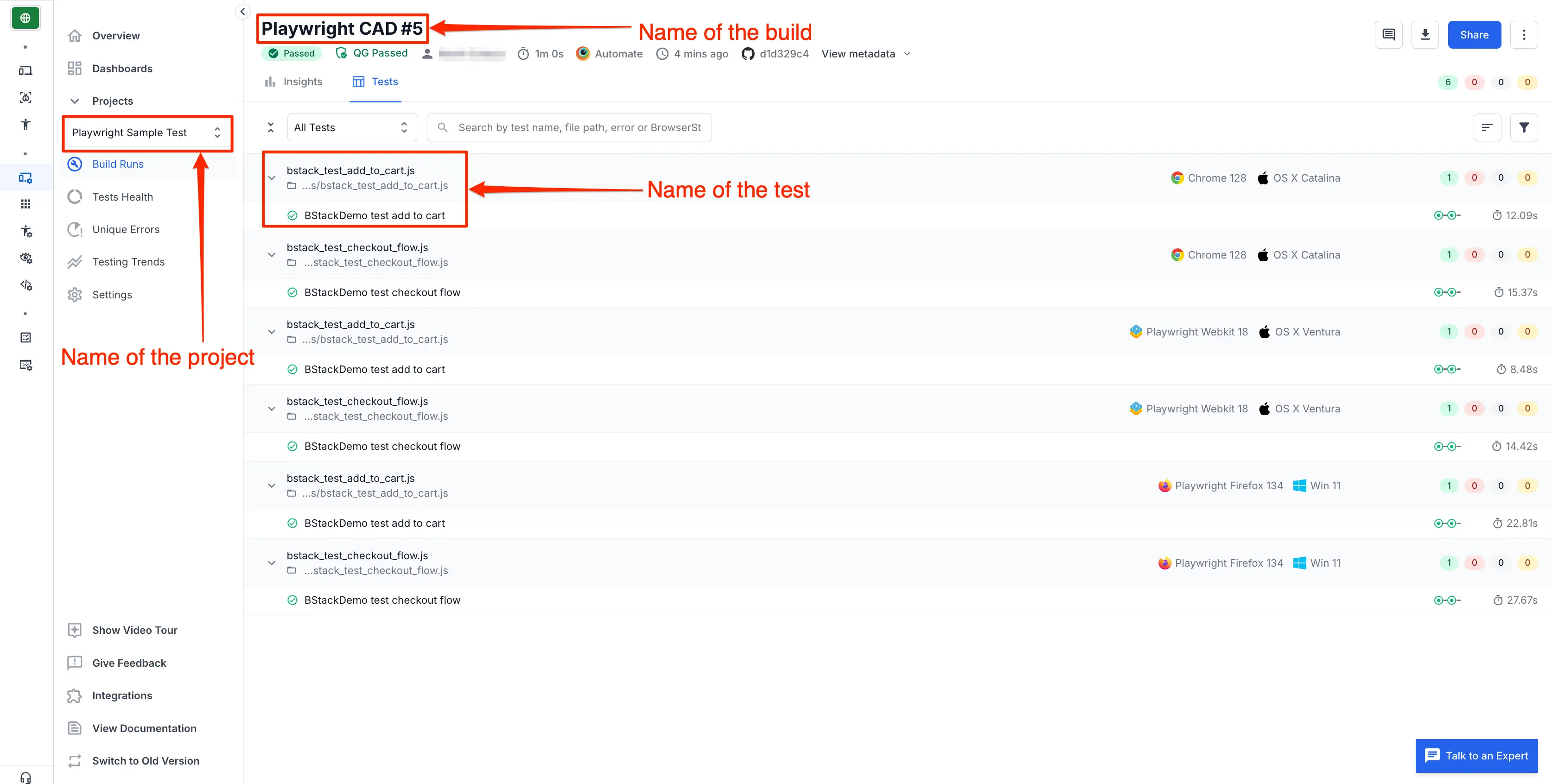 nameof each Playwright test because that will most probably not change across different build runs. Also, it is advisable to keep meaningful names of tests so that it becomes easily identifiable in the BrowserStack Dashboard.