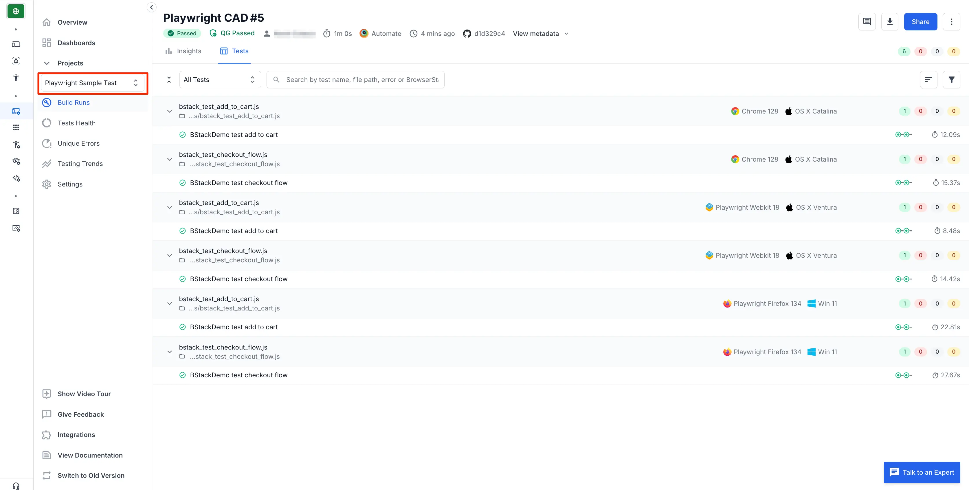 buildcapability will organize all test sessions with the samebuildname, under the same build. You can then access any session in that build simply by clicking on the build in the left pane of Automate Dashboard. - Using the