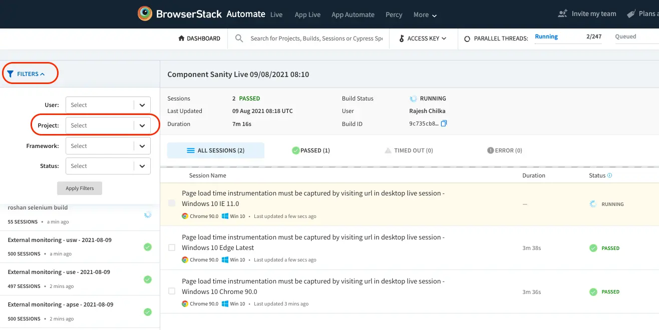 projectcapability would let you filter out only the tests that pertain to that project, in the BrowserStack Dashboard. The following snapshot of the Automate Dashboard shows the filter on the left pane that you can use to apply theprojectfilter.