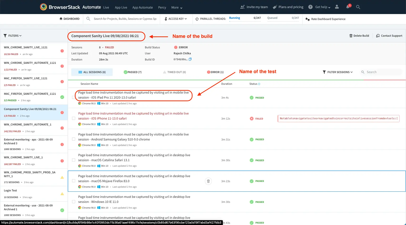 The below snapshot of a typical Automate Dashboard shows the list of builds in the left pane. On clicking on any build name, the right side shows the list of sessions that are a part of that build (basically all sessions where the same build name was used in capability). You can also see the test name for each session and it is evident from the example that using descriptive test names is beneficial for debugging purposes later on.