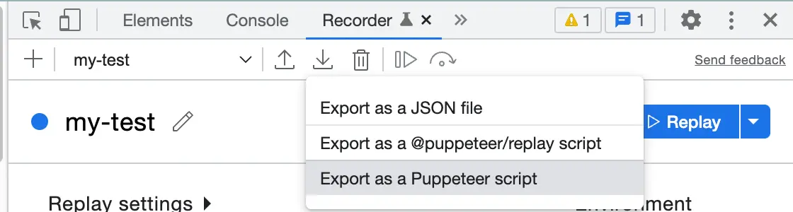 - Click the Export icon and select the Export as a Puppeteer script option.