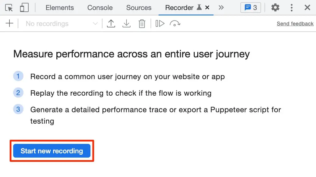 You need to enable the Recorder in your Chrome browser to record your tests. Once enabled, you can record your test case, and export the Puppeteer scripts that you can integrate with BrowserStack.