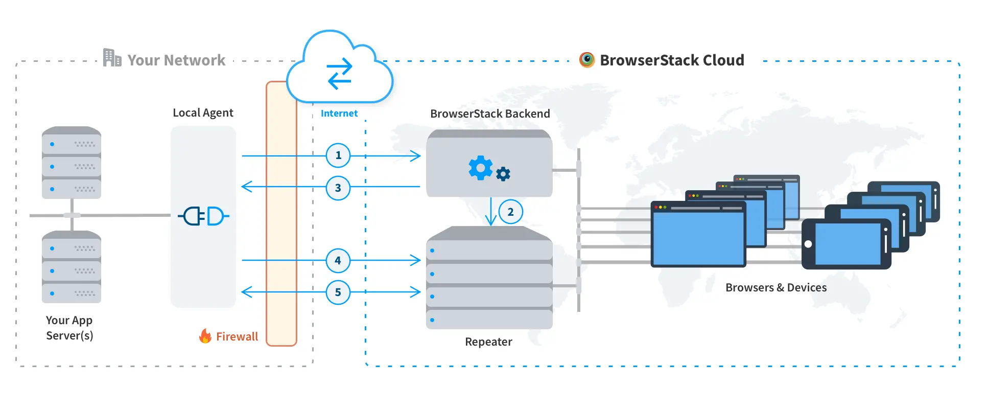 - All further communication between your internally hosted website and the remote browsers of BrowserStack cloud, takes place using this persistent connection