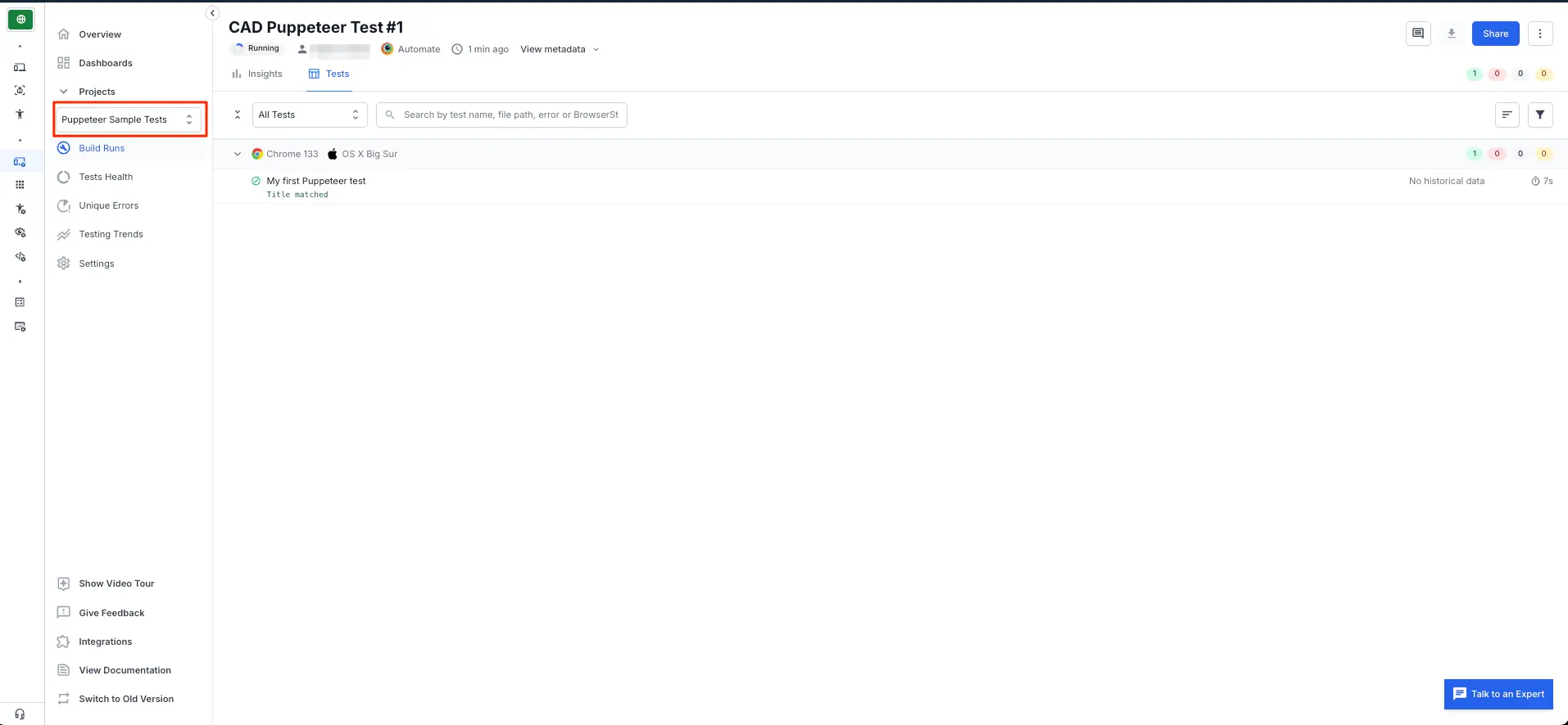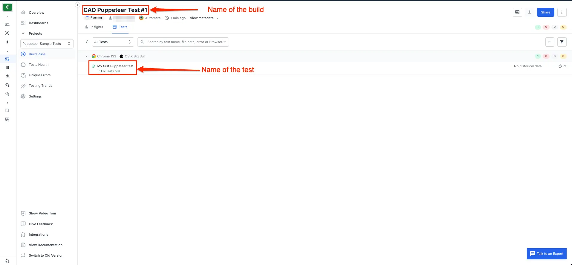 nameof each Puppeteer test because that will most probably not change across different build runs. Also, it is advisable to keep meaningful names of tests so that it becomes easily identifiable in the BrowserStack Dashboard.