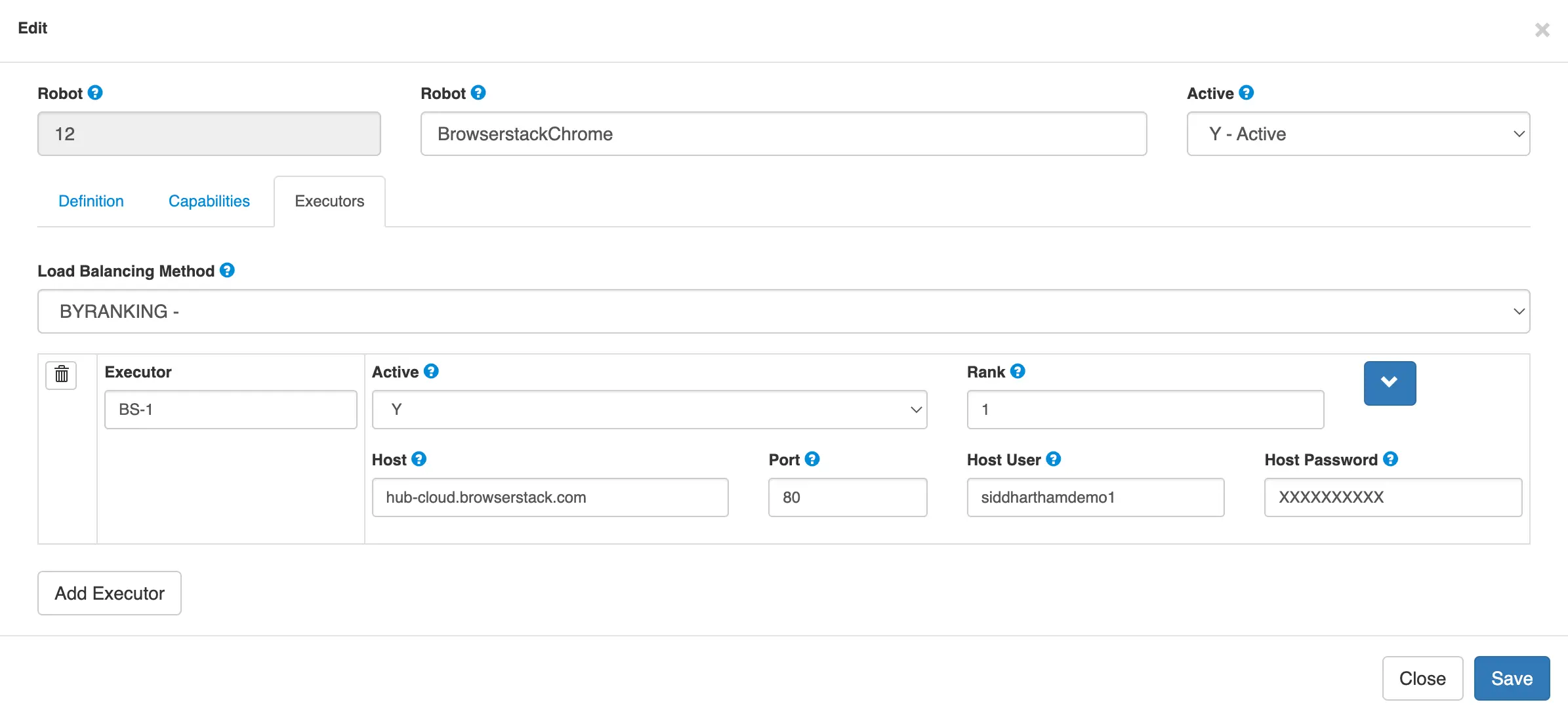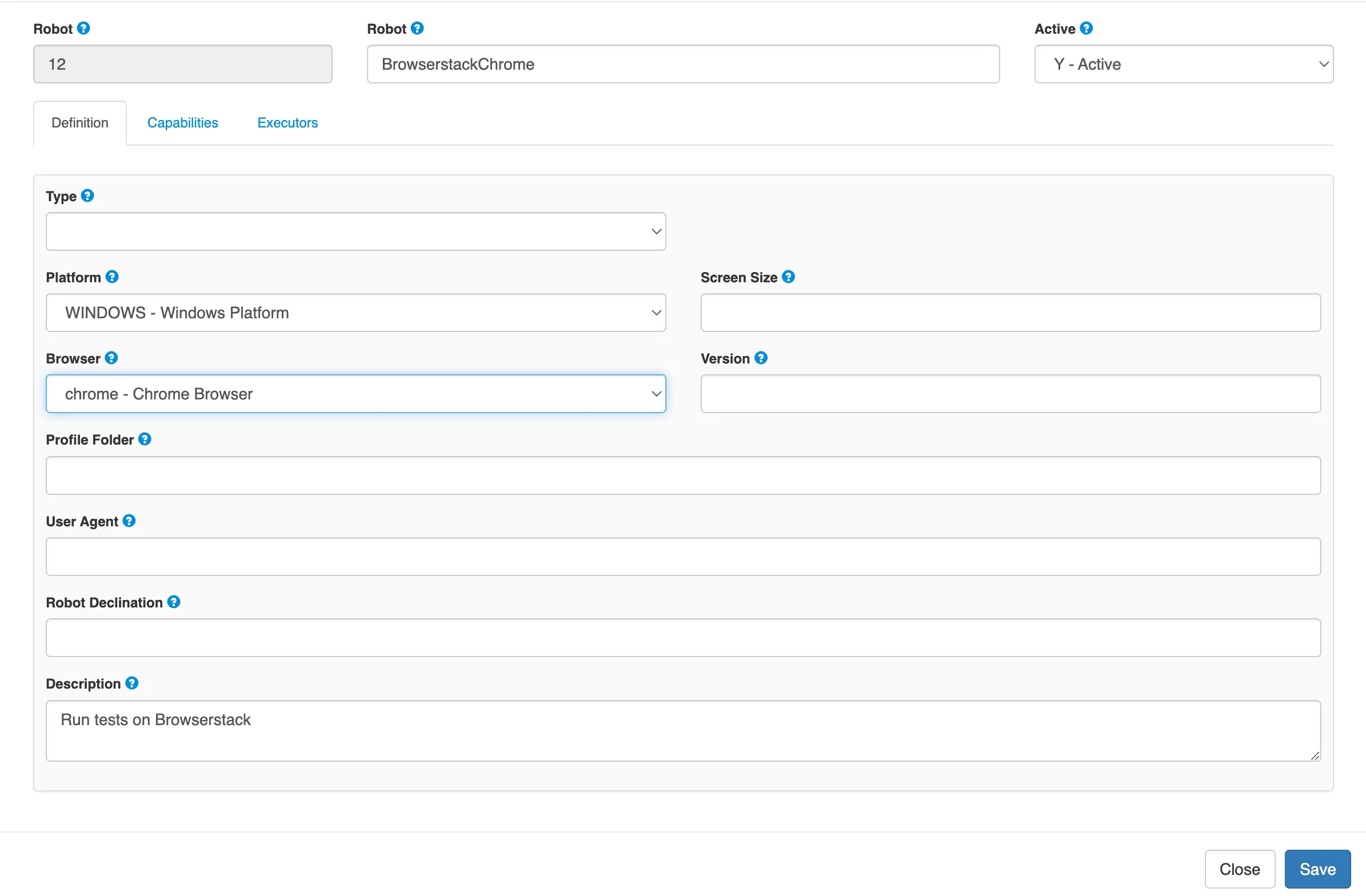 The BrowserStack robot includes your BrowserStack credentials and OS-browser combination for which you want to run your test on BrowserStack. For each OS-browser combination that you want to run your test for, you must create a unique robot.