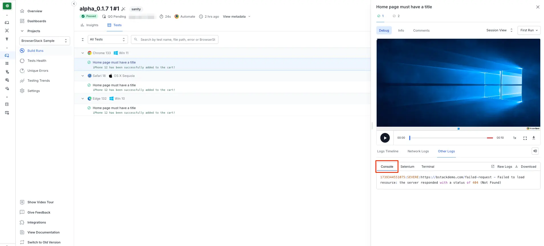Console Logs capture the browser’s JS console output at various steps of the test to troubleshoot JavaScript issues. You can retrieve Console logs using both the Automate dashboard, as well as the REST API to access console logs. Currently, this works only for Chrome browsers, and we will roll this out to other browsers soon.