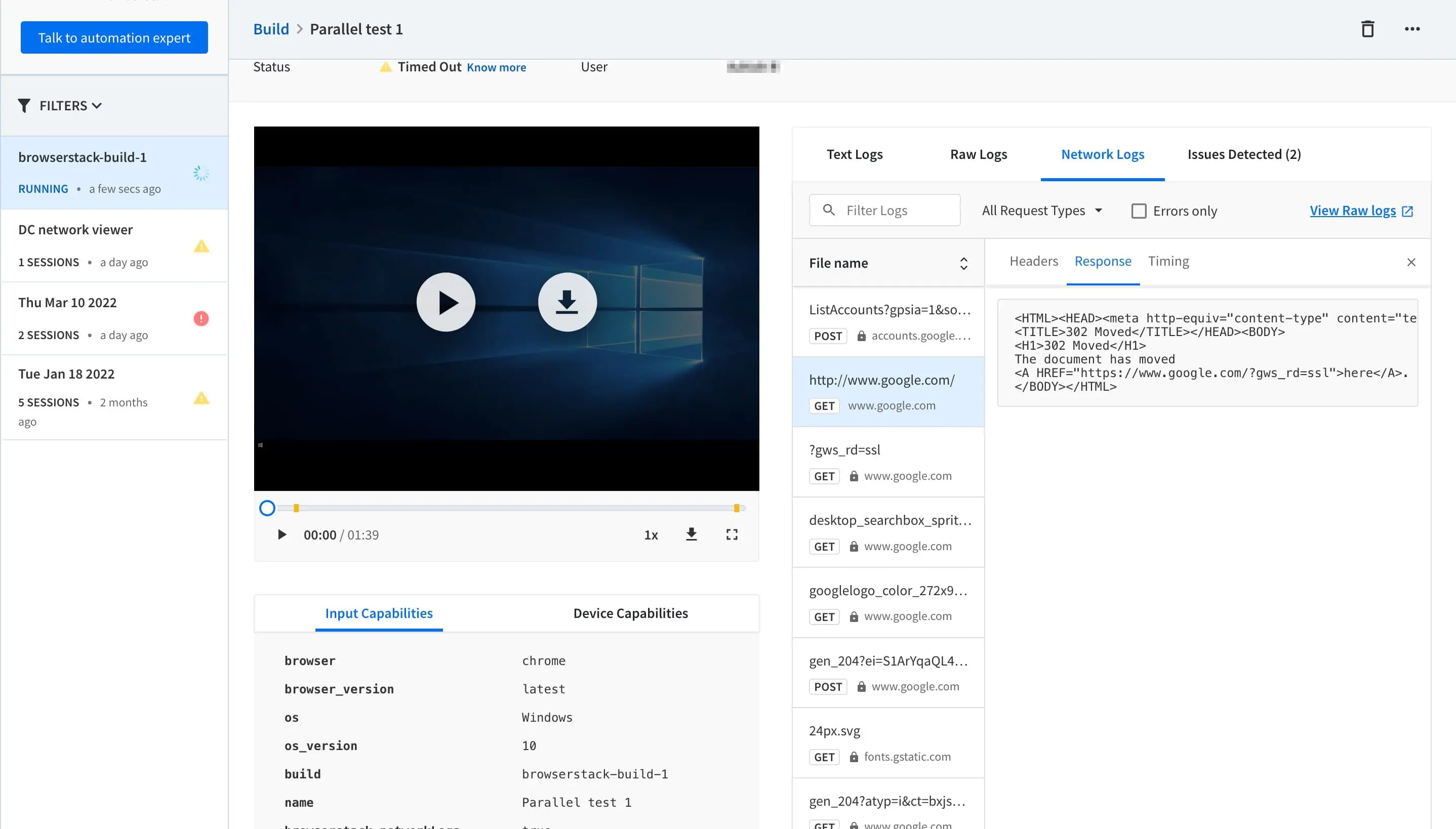When you run tests on BrowserStack Automate, each session generates detailed log data, including network logs. These logs are accessible through the Automate dashboard and REST APIs, and are often used for debugging test failures.