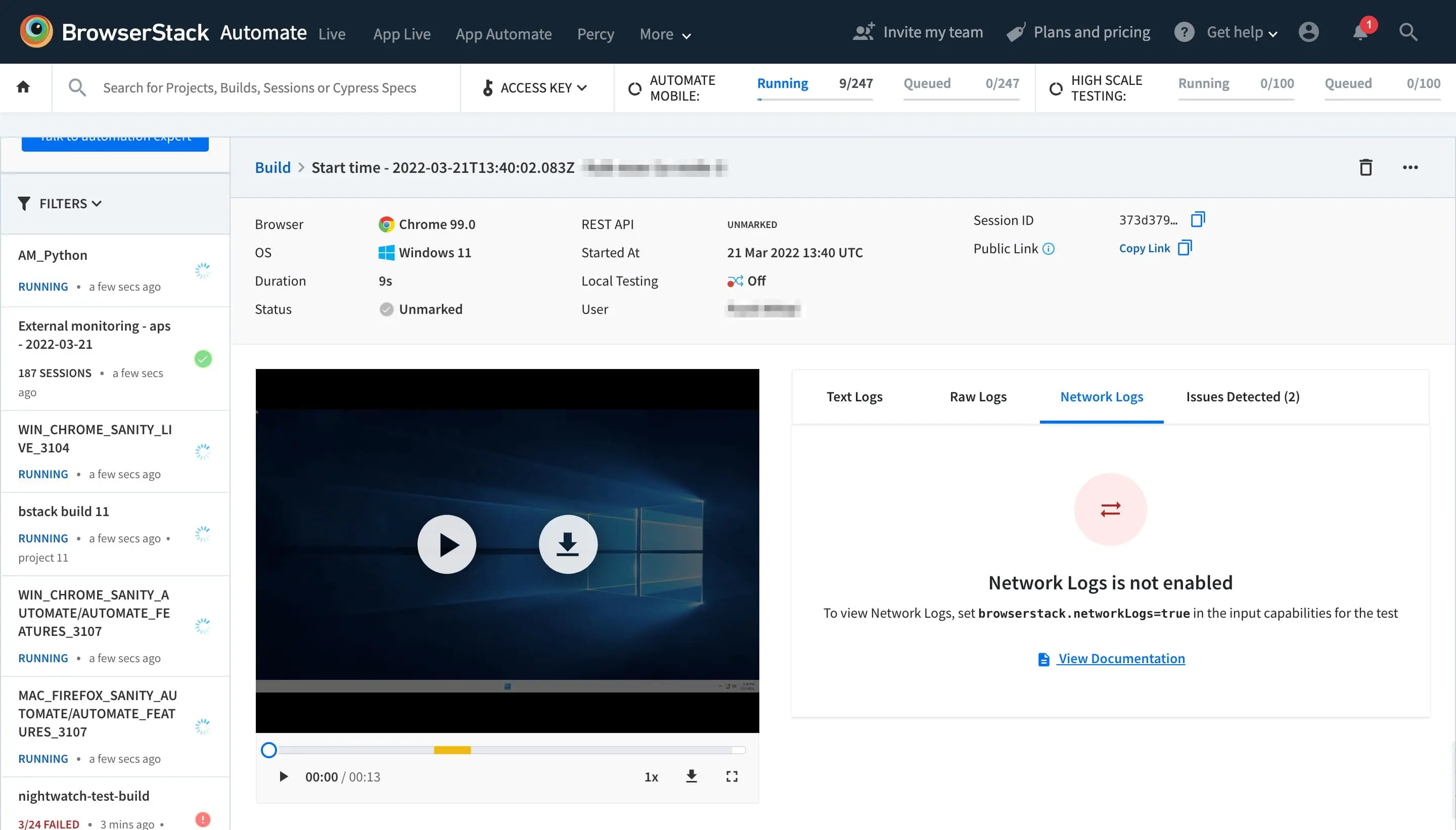 When you run tests on BrowserStack Automate, each session generates detailed log data, including network logs. These logs are accessible through the Automate dashboard and REST APIs, and are often used for debugging test failures.