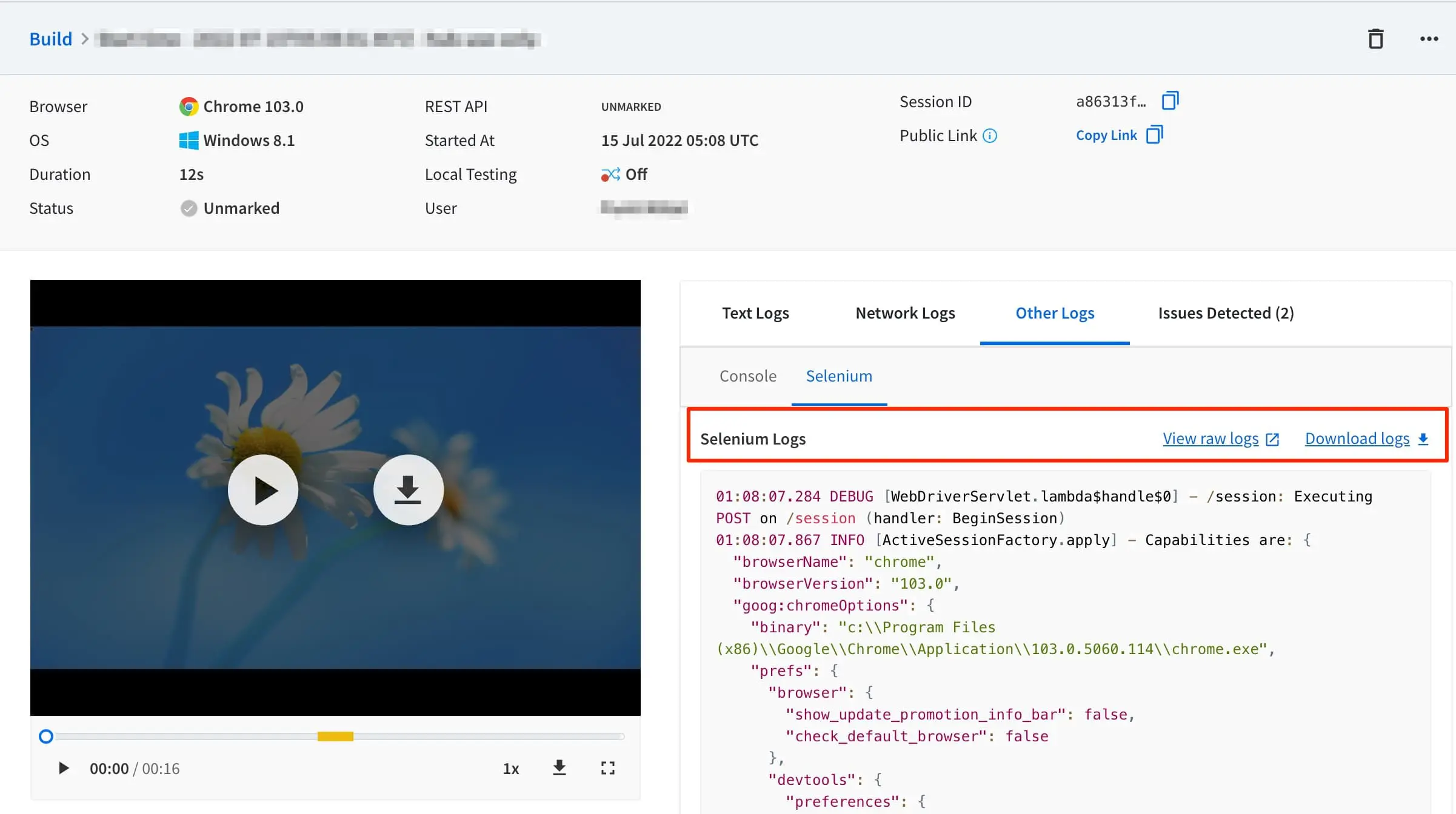 Selenium logs capture information about every Selenium command in your test script along with the browser preferences that you have configured. These logs provide insight into anything that might have led to your tests to fail. On the Automate dashboard, click the Other Logs tab to view the Selenium logs. You can also use the REST API to access Selenium logs.